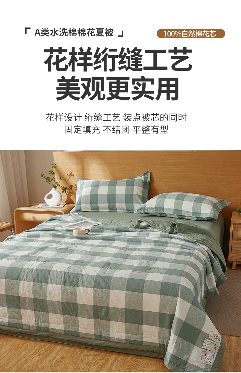 2025新款A类100%新疆棉花夏凉被纯棉全棉填充原棉空调被手工宽边水洗棉夏被 绿中格