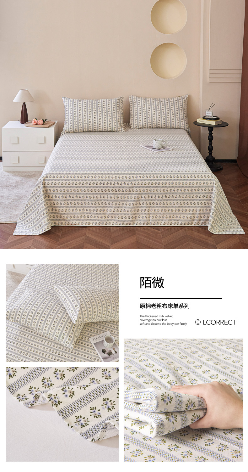 • 91家纺网 家纺一手货源 找家纺 绒艺席业 2025新款简约原棉印花老粗布床单 浅蓝小格