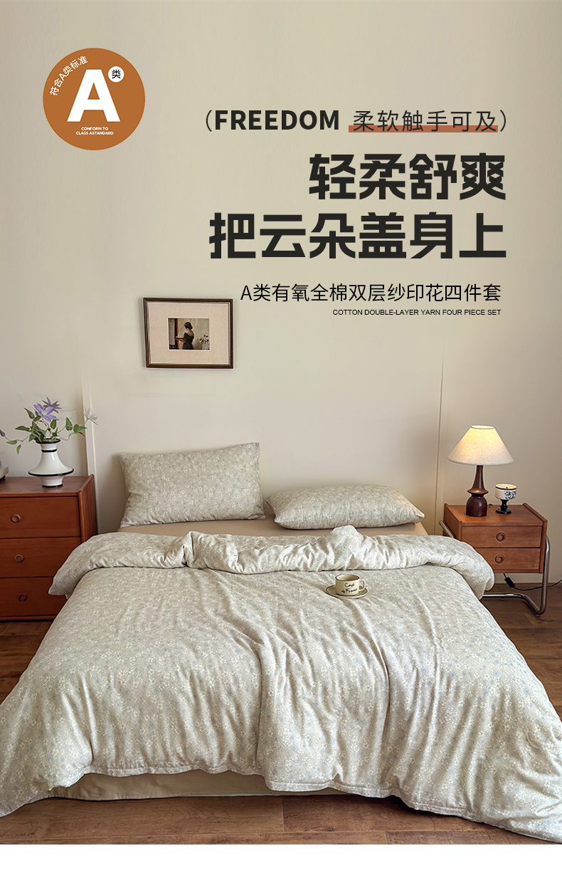 商品名称:曲之慕2025新款A类母婴级有氧全棉纯棉双层纱印花四件套 弗拉-黄