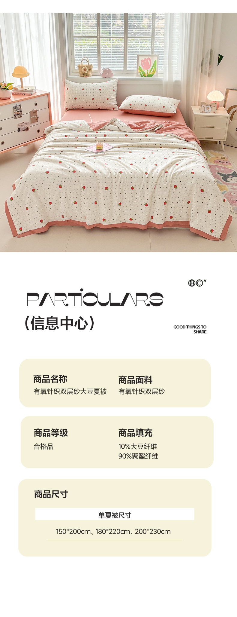 当前位置: 91家纺网 > 商品网购 > 被子 > 夏被 > 典冠 2025新款有氧针织双层纱大豆夏被夏凉被空调被 草莓物语