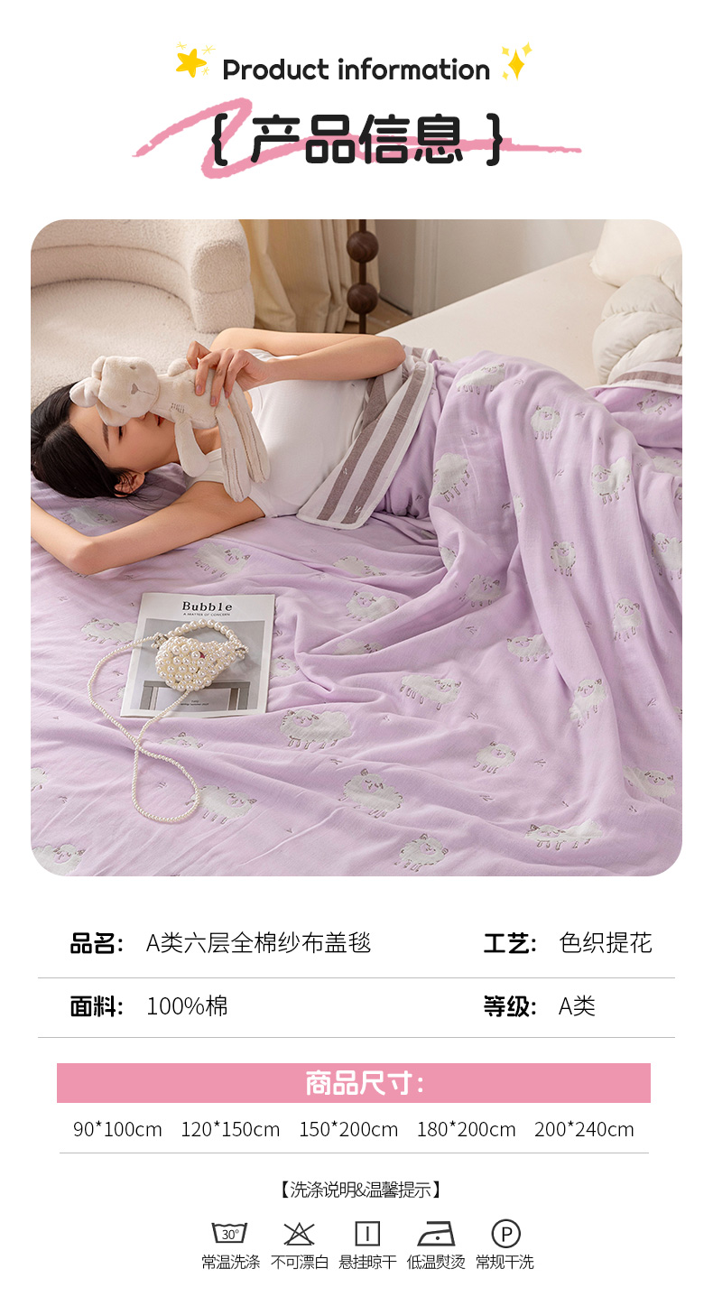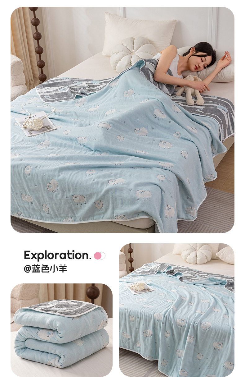 商品名称:乐家毛巾被(工厂自产自销) 2025春夏新款亲肤舒适六层纱布被 蓝色小羊