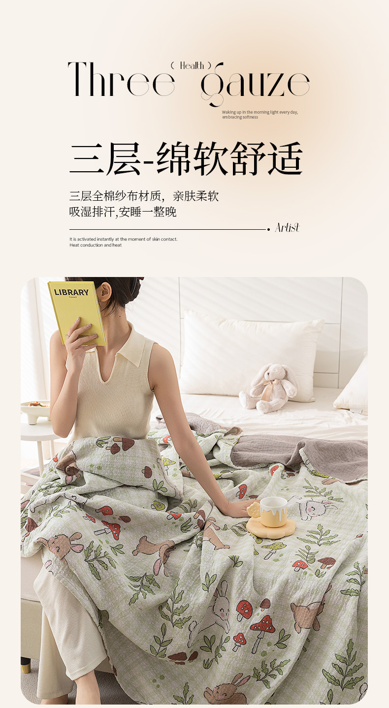 乐家毛巾被(工厂自产自销) 2025春夏新款三层全棉纯棉印花毛巾被 蝴蝶结兔子