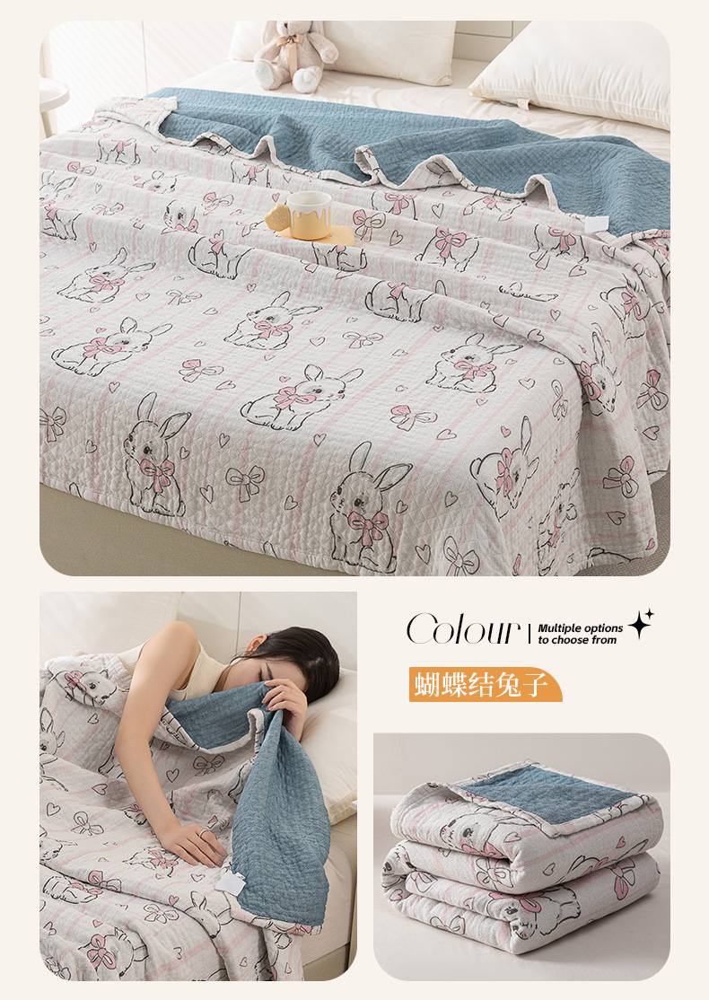 商品名称:乐家毛巾被(工厂自产自销) 2025春夏新款三层全棉纯棉印花毛巾被 蝴蝶结兔子