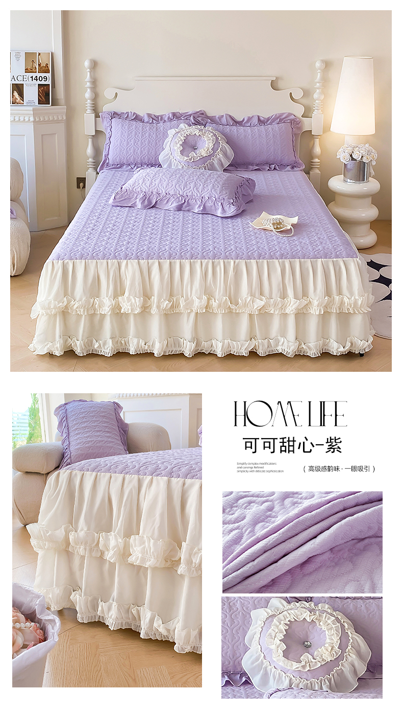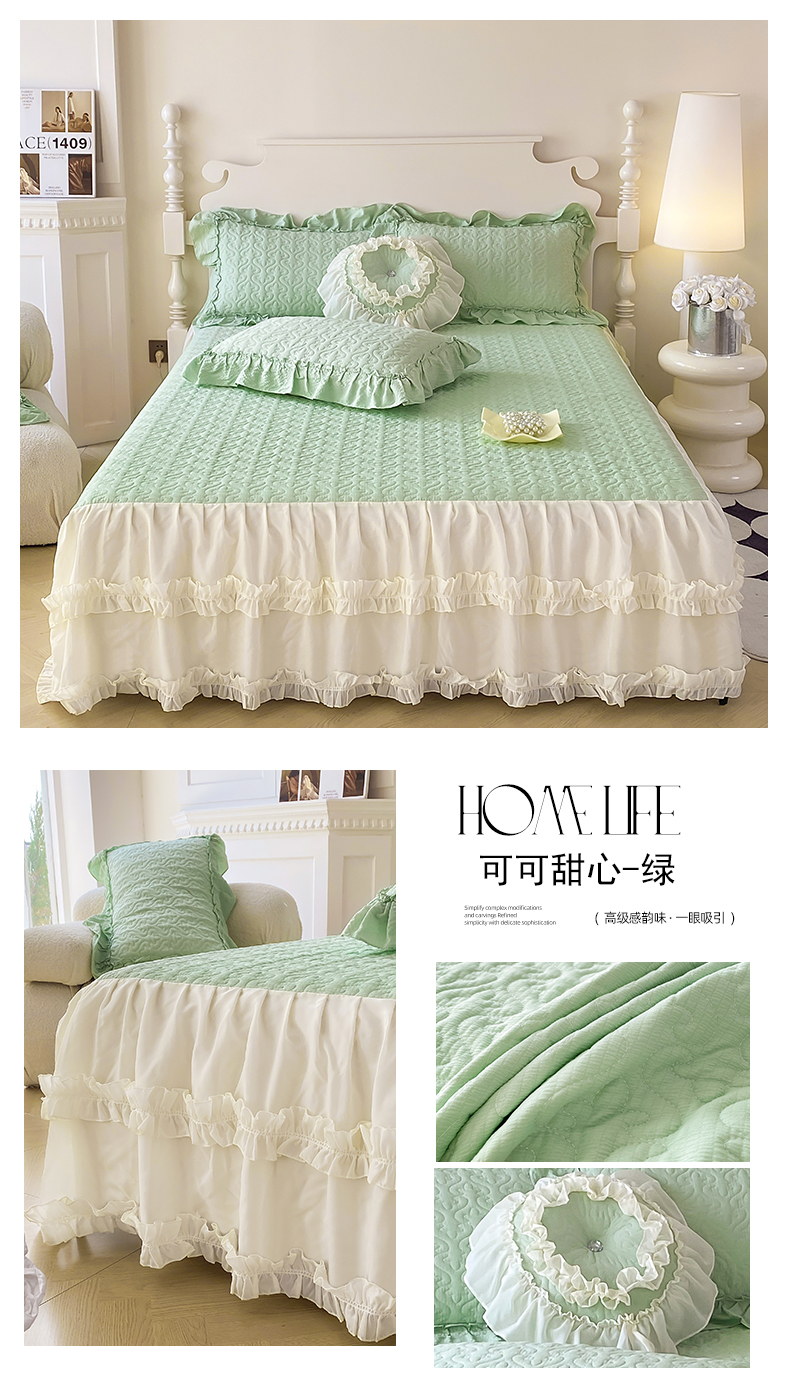 • 91家纺网 家纺一手货源 找家纺 花香四季家纺 2025新款法式夹棉绗缝床裙单件三件套蕾丝公主风-可可甜心 可可甜心-绿