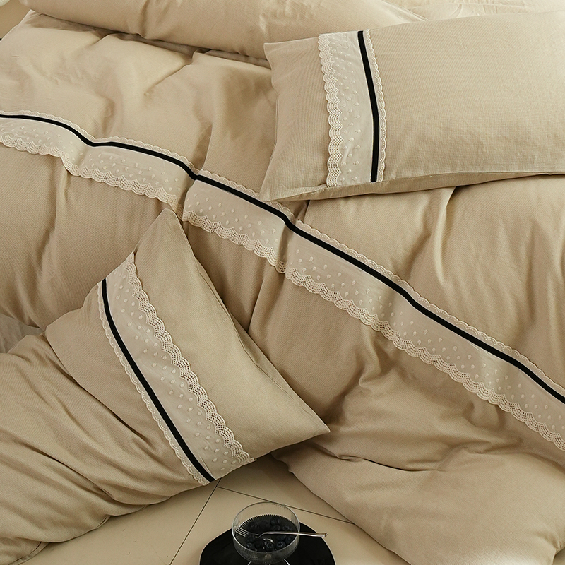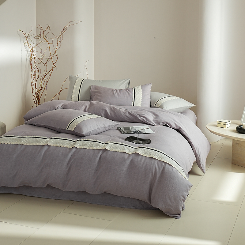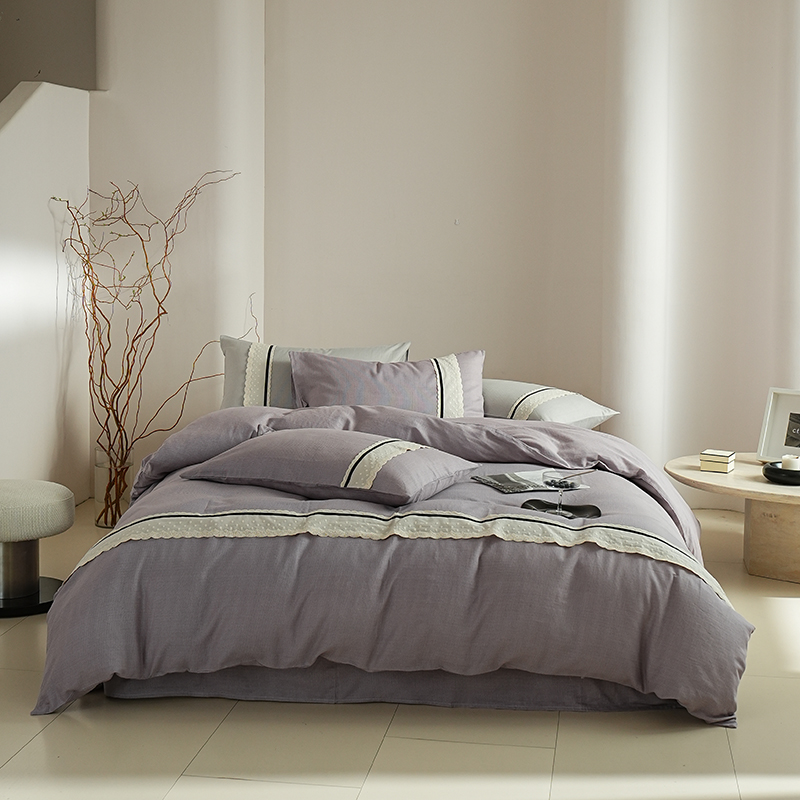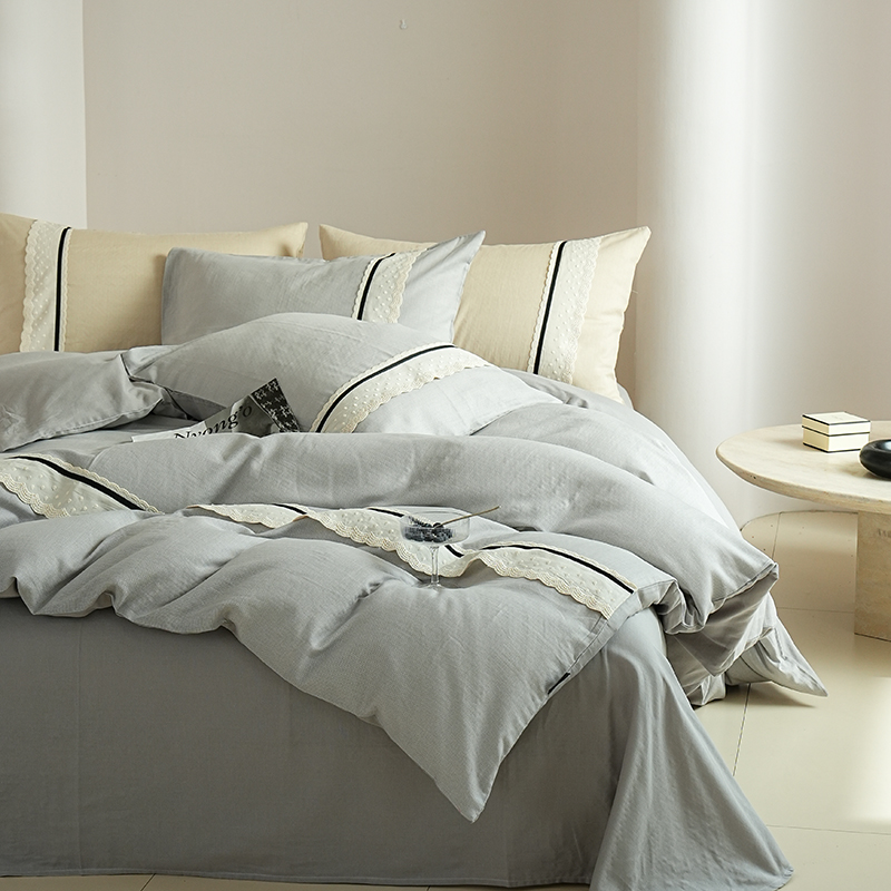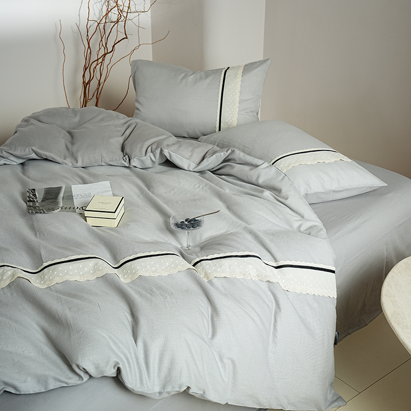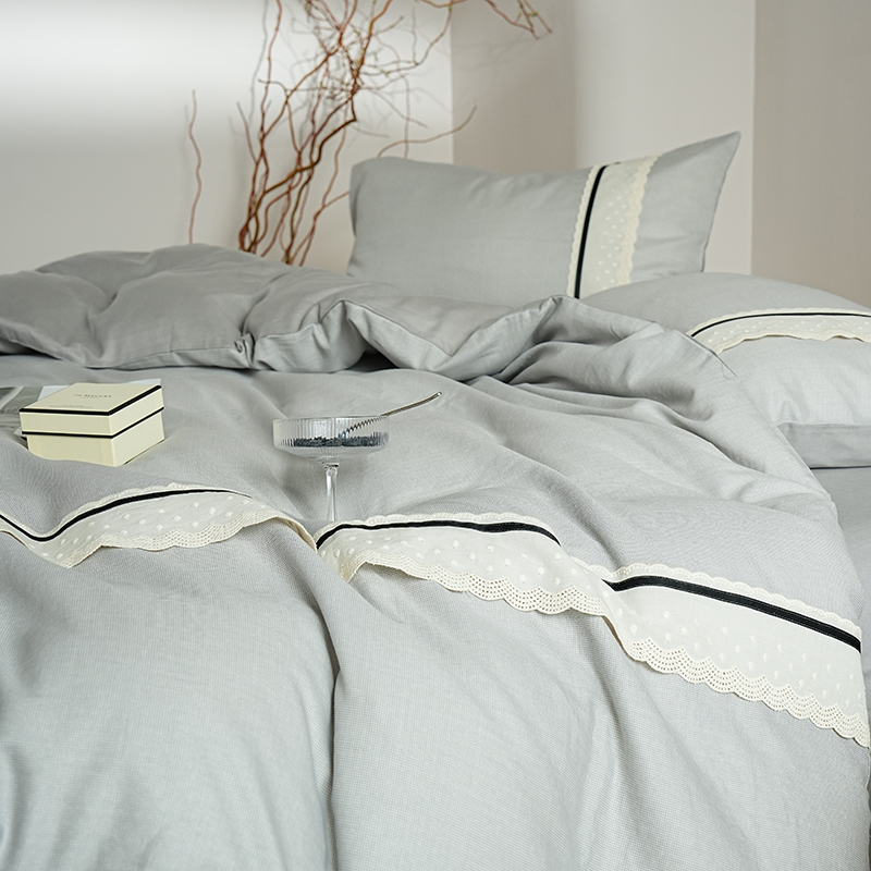 丽卡家纺 2025新款花边压褶瑟琳娜100%全棉双层纱四件套 高级灰