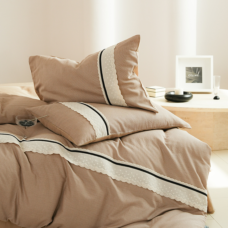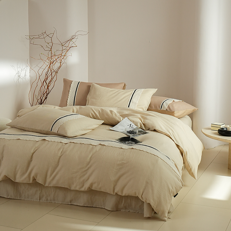 (总)丽卡家纺 2025新款花边压褶瑟琳娜100%全棉双层纱四件套,茶褐棕,高级灰,玫瑰粉,浅卡其,薰衣草紫