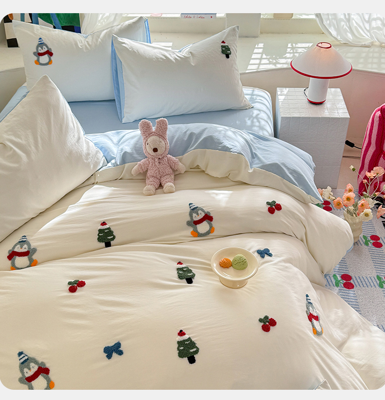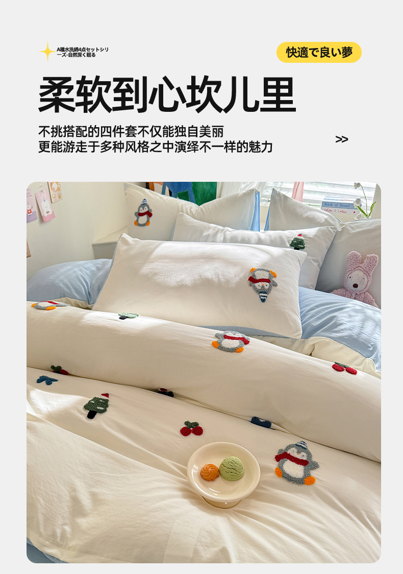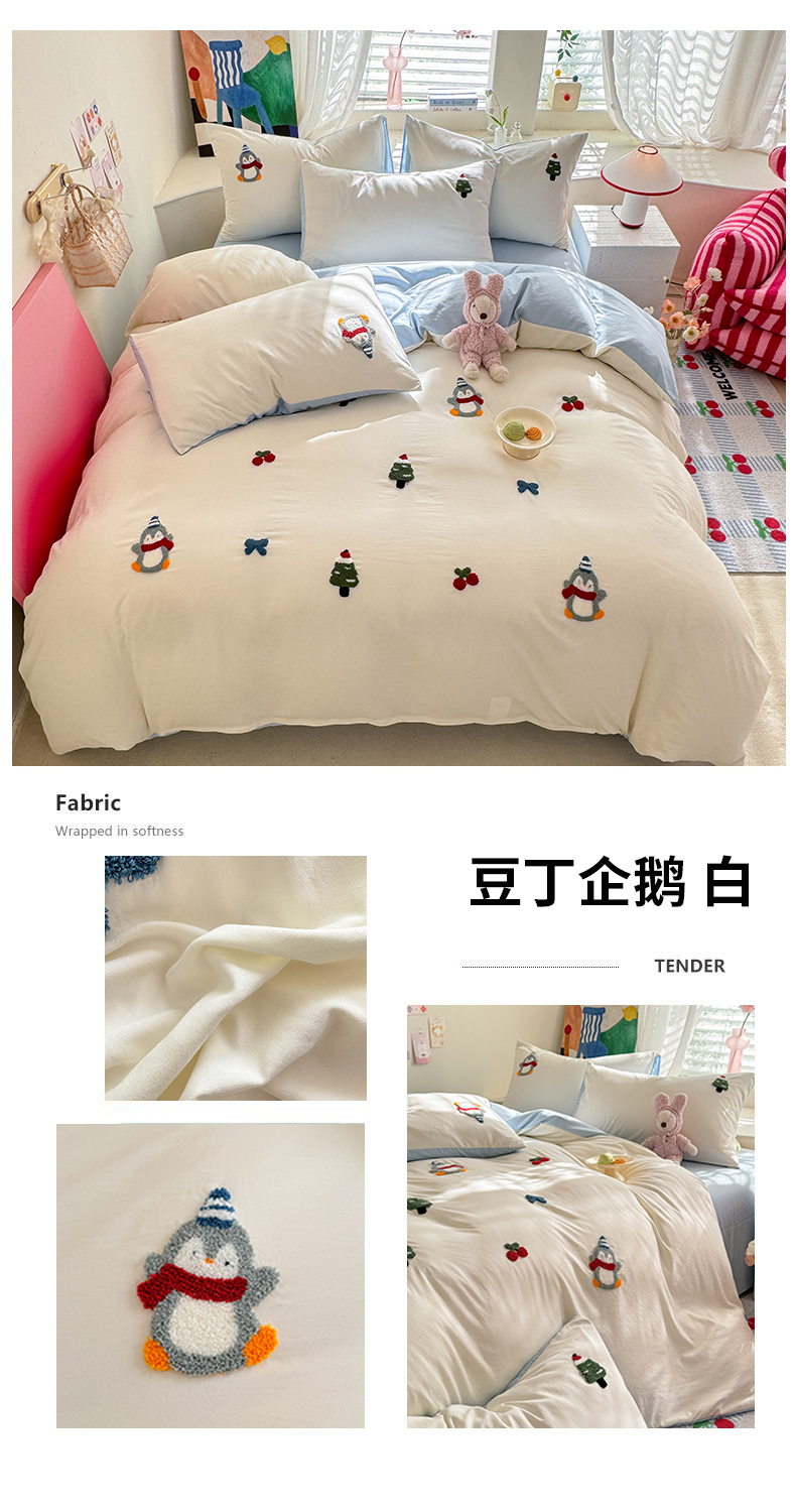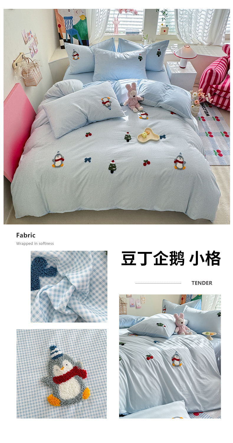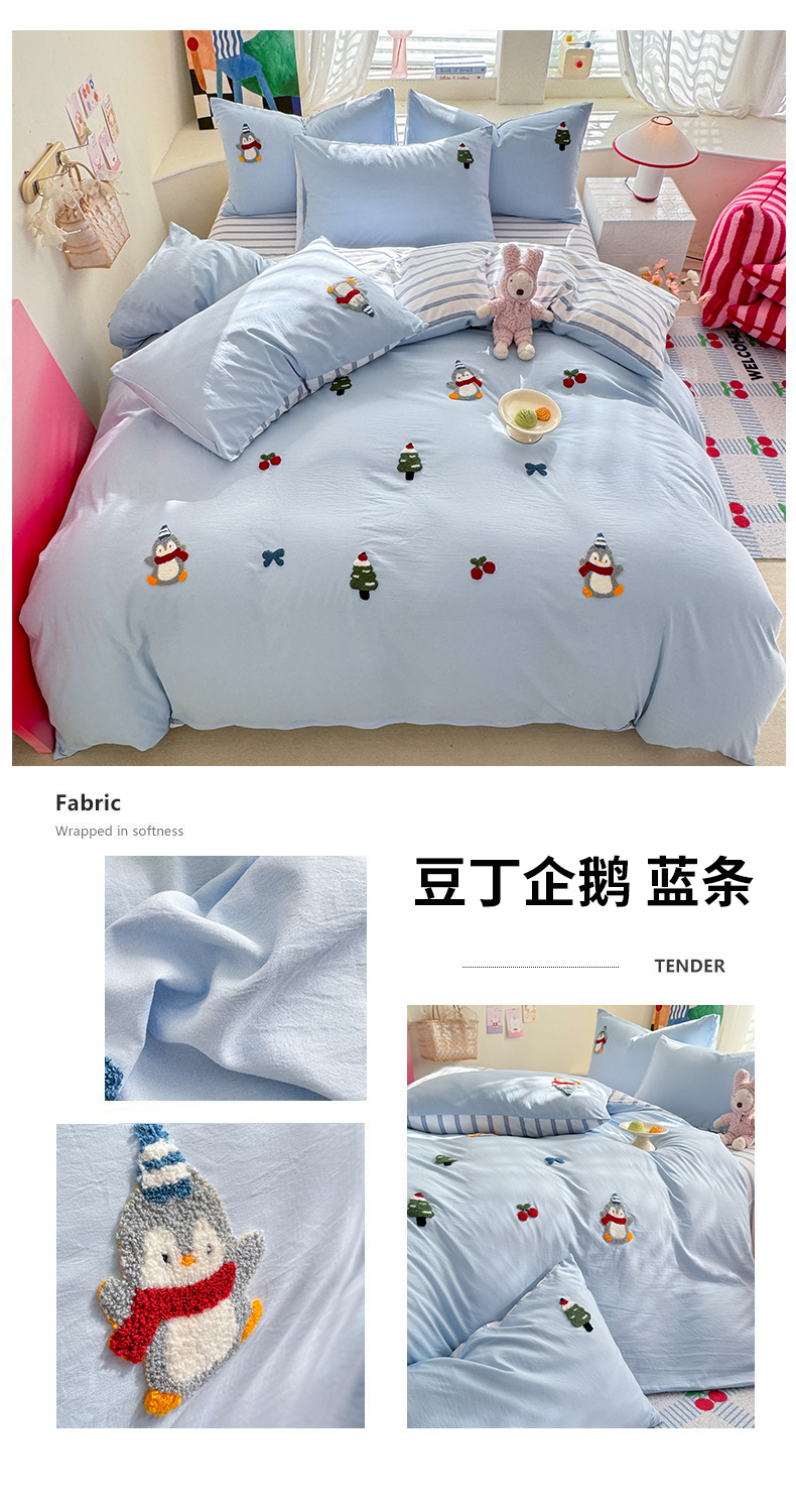 (总)多品家纺 2025新款超柔水洗棉毛巾绣四件套系列-豆丁企鹅,豆丁企鹅-白,豆丁企鹅-蓝条,豆丁企鹅-小格