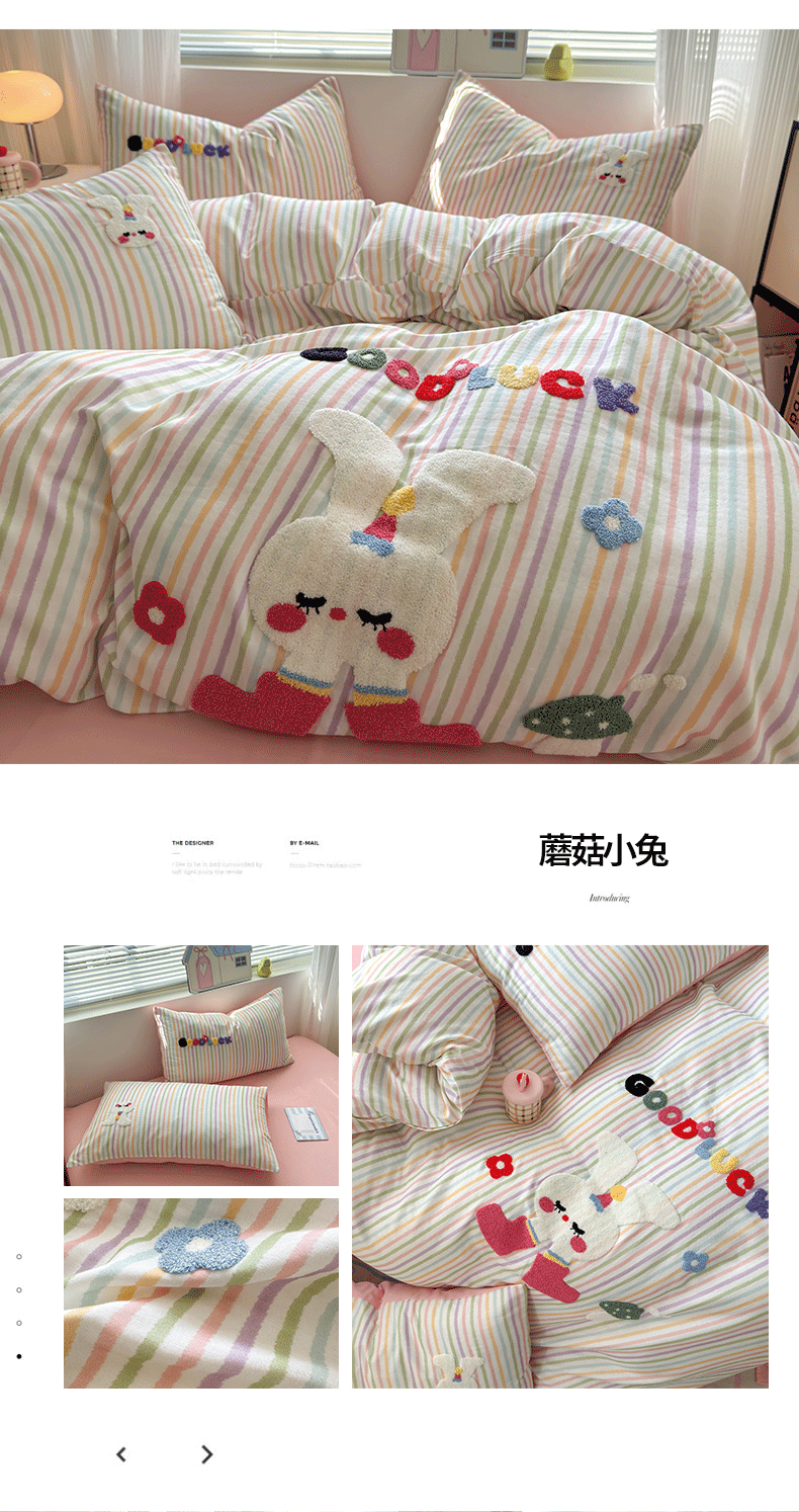 商品名称:如意朵 2025新款全棉双层纱小清新绣花四件套(专版花型) 蘑菇小兔