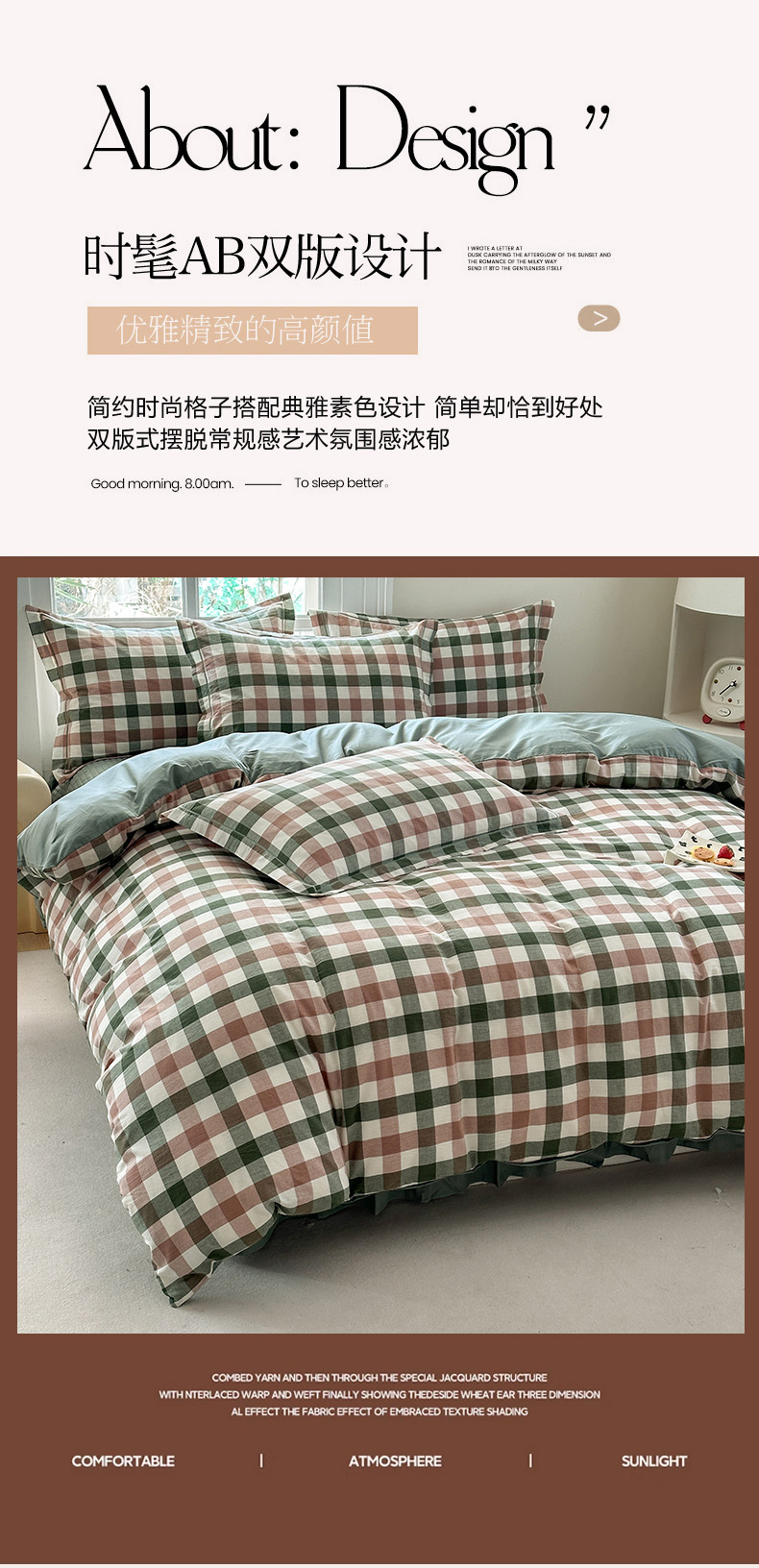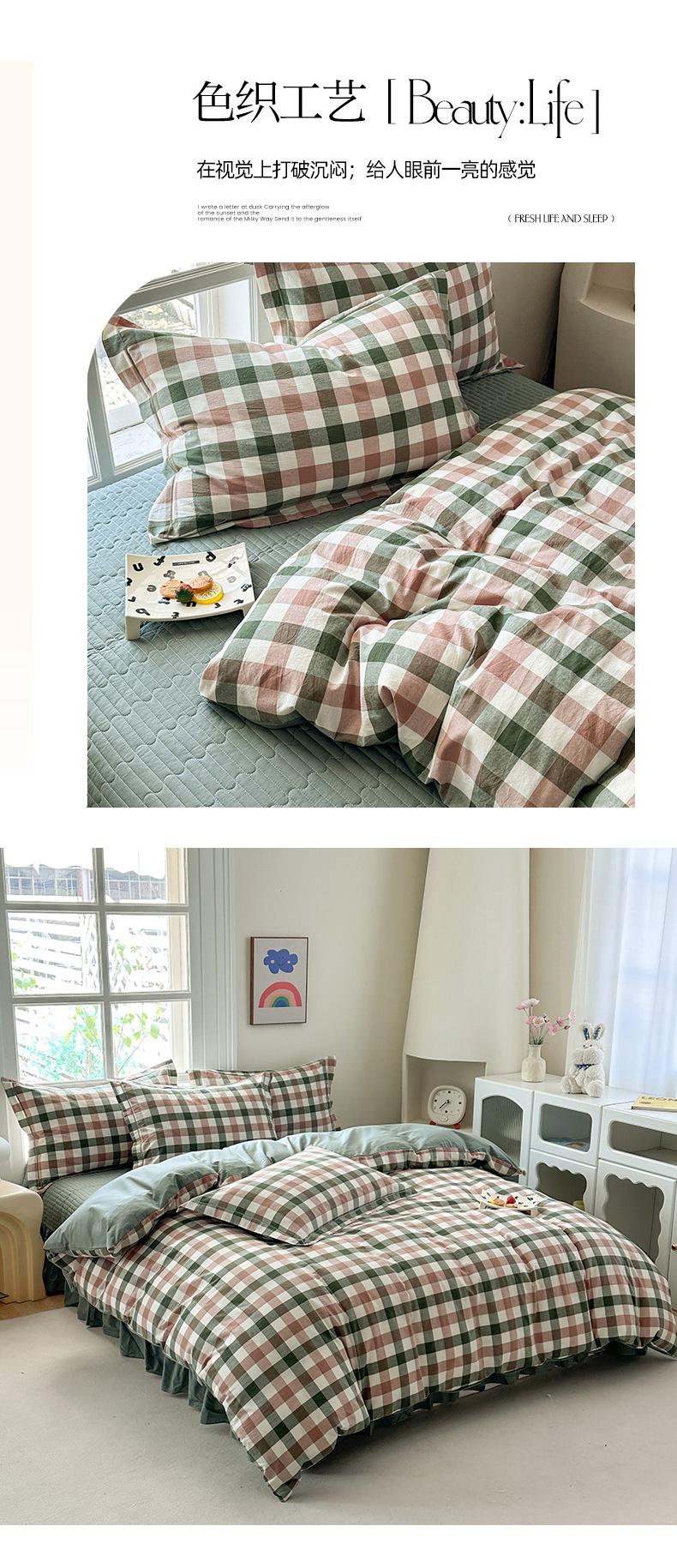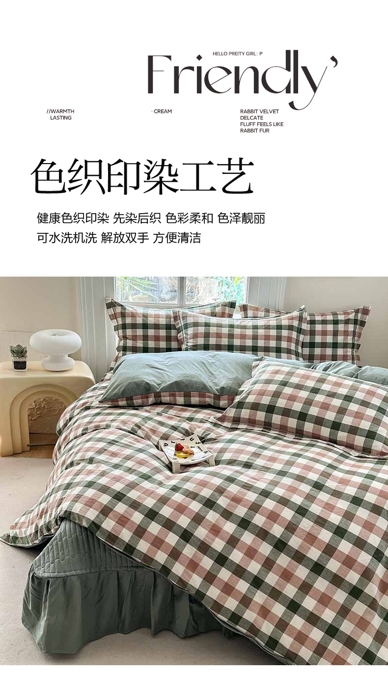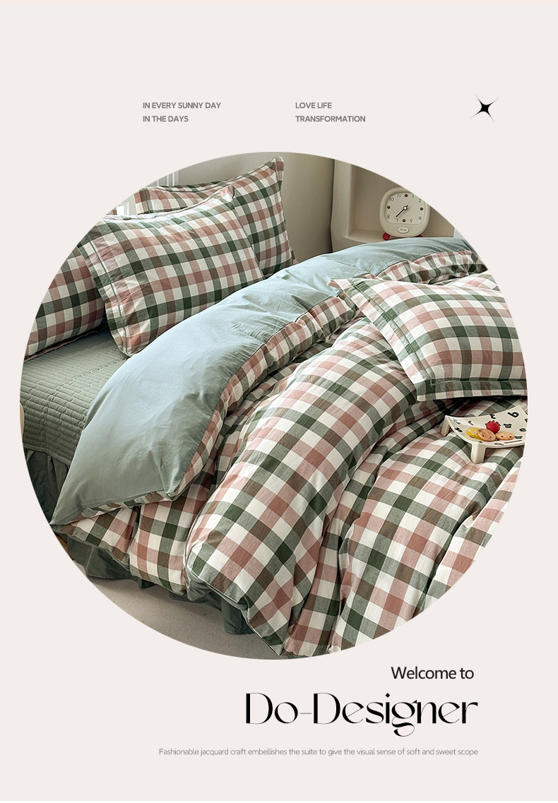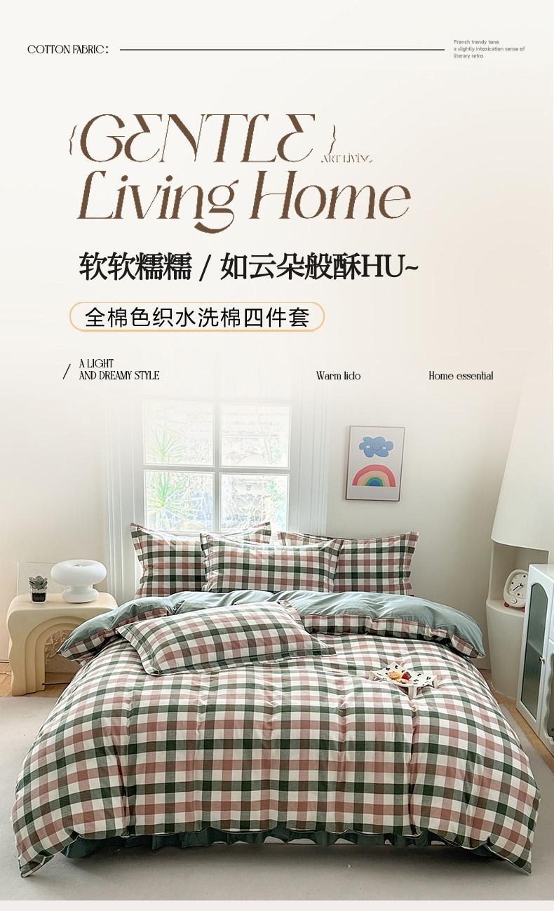 (总)金窝窝家纺 2025新款全棉色织水洗棉床盖四件套,春意盎然淡绿色,春薏时尚灰,多爱多粉色,繁星奶咖米格,绿咖时尚格,米菲灰,米格,浅兰小格