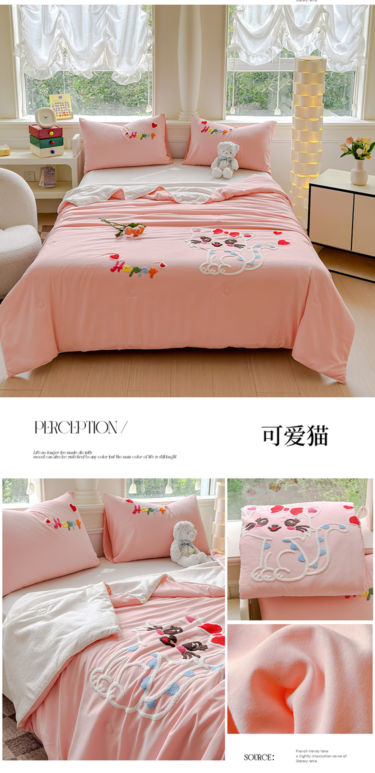 商品名称:2025新款水洗棉毛巾绣夏被卡通夏凉被薄被子 粉白-幸运猫