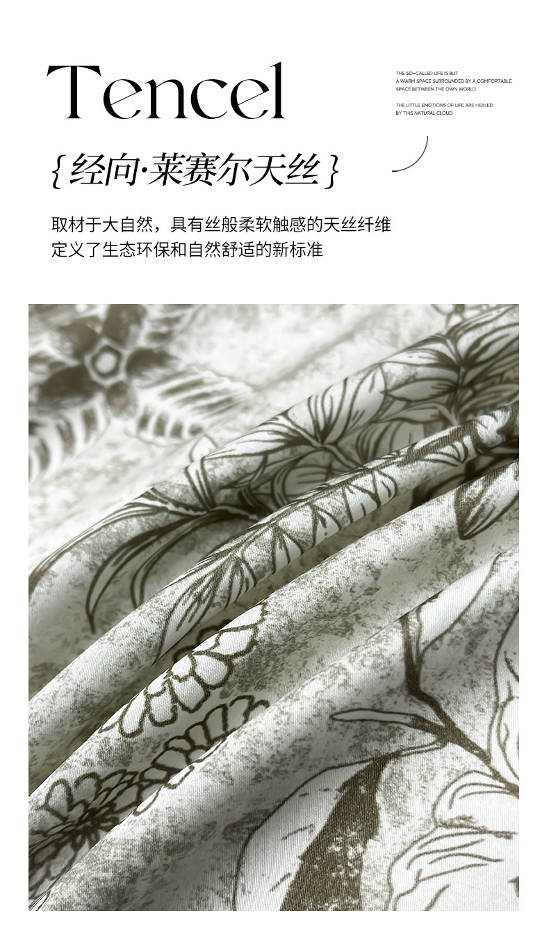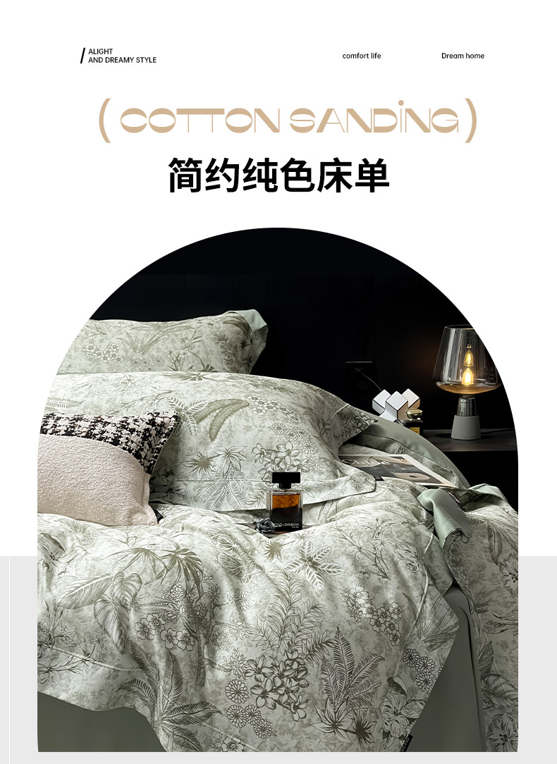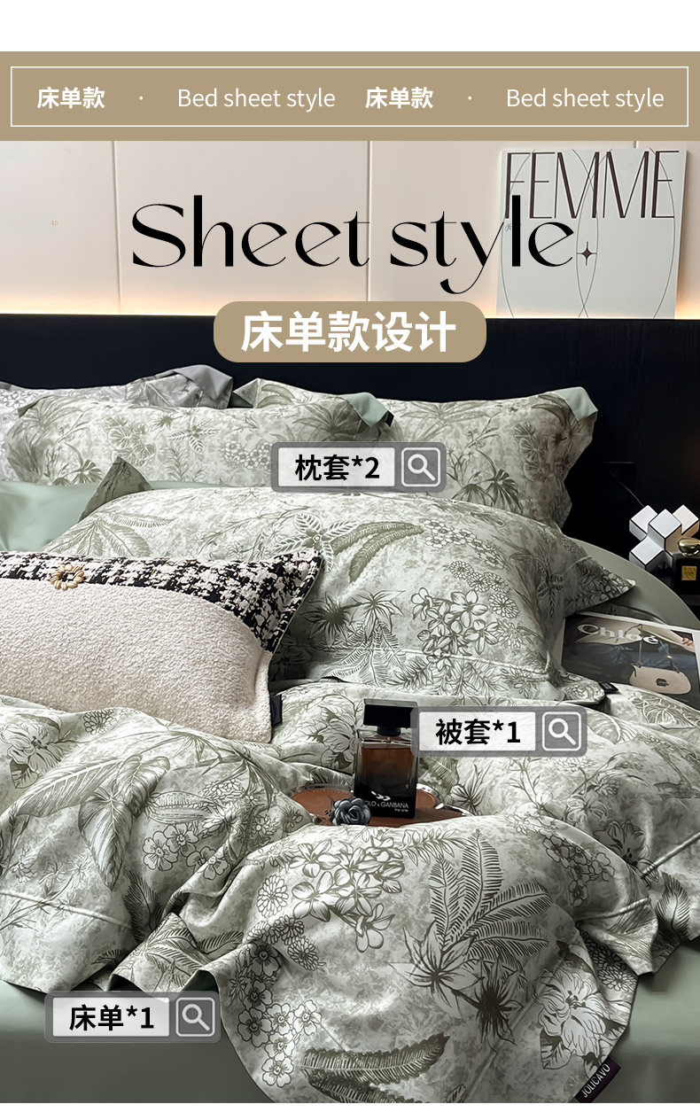 商品名称: 2025高端轻奢A类天丝棉印花四件套全棉数码印花丝滑裸睡被套真丝夏季床上用品 丽芙-绿