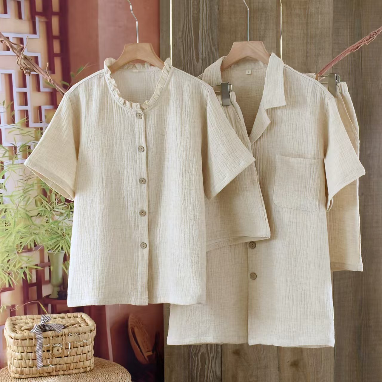 (总)双梦毛巾 2025新款夏季新款亚麻家居服情侣爆款套装 休闲简约短袖短裤男女士睡衣,女士,男士