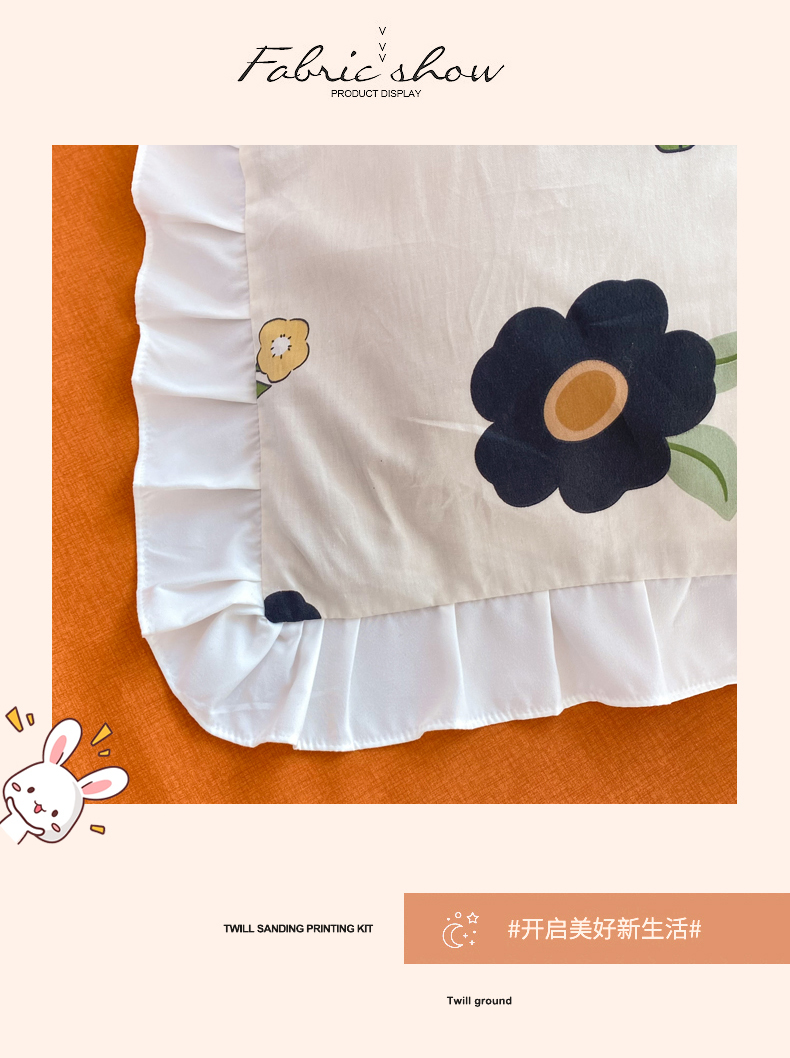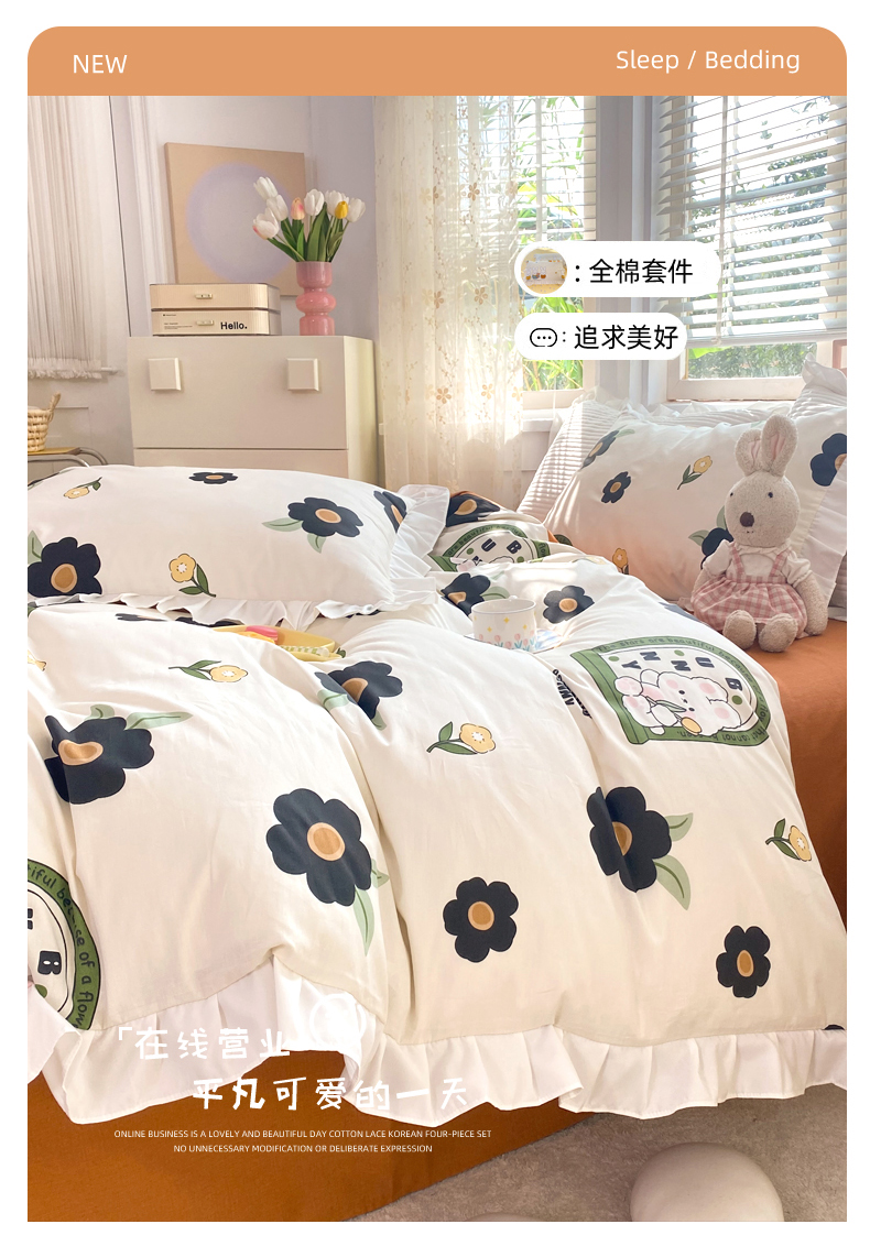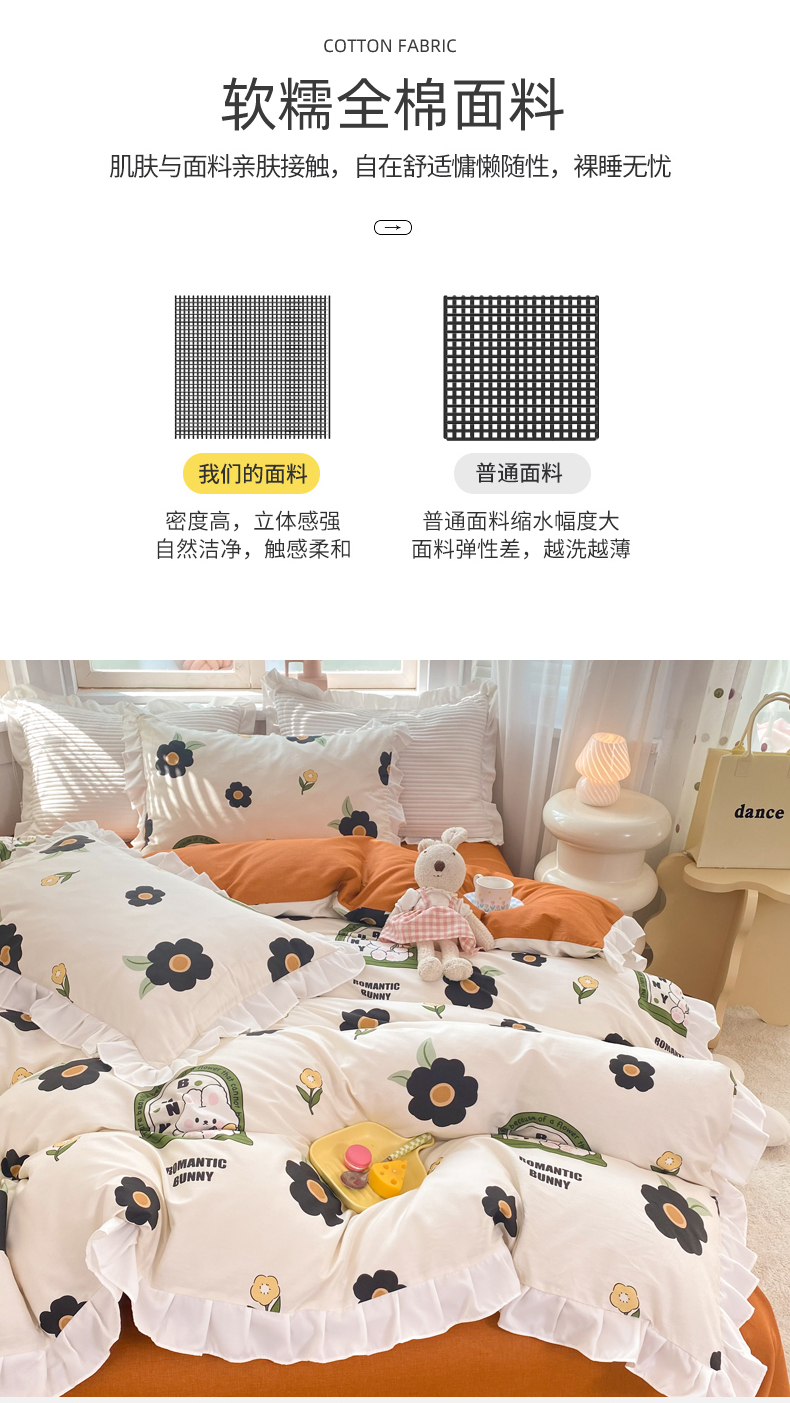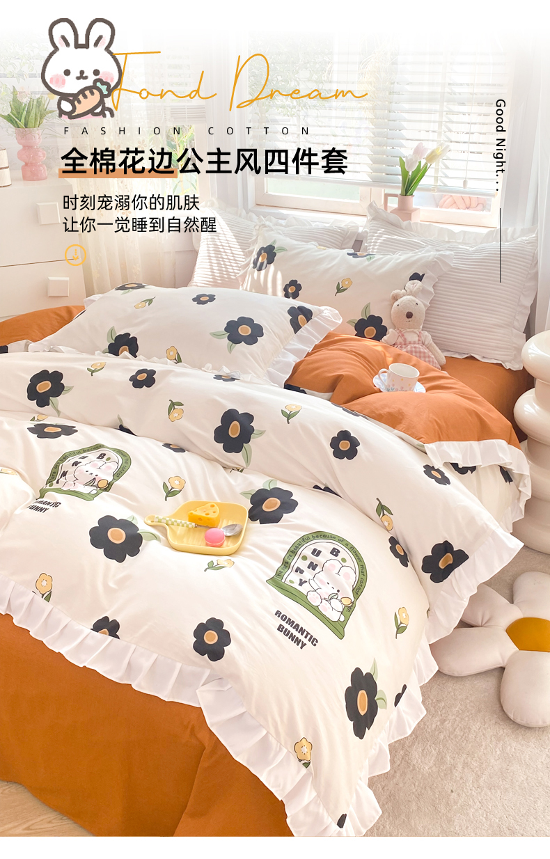 商品名称:玉元坊 2025春夏新款公主风全棉纯棉花边被套床单四件套 邦尼兔