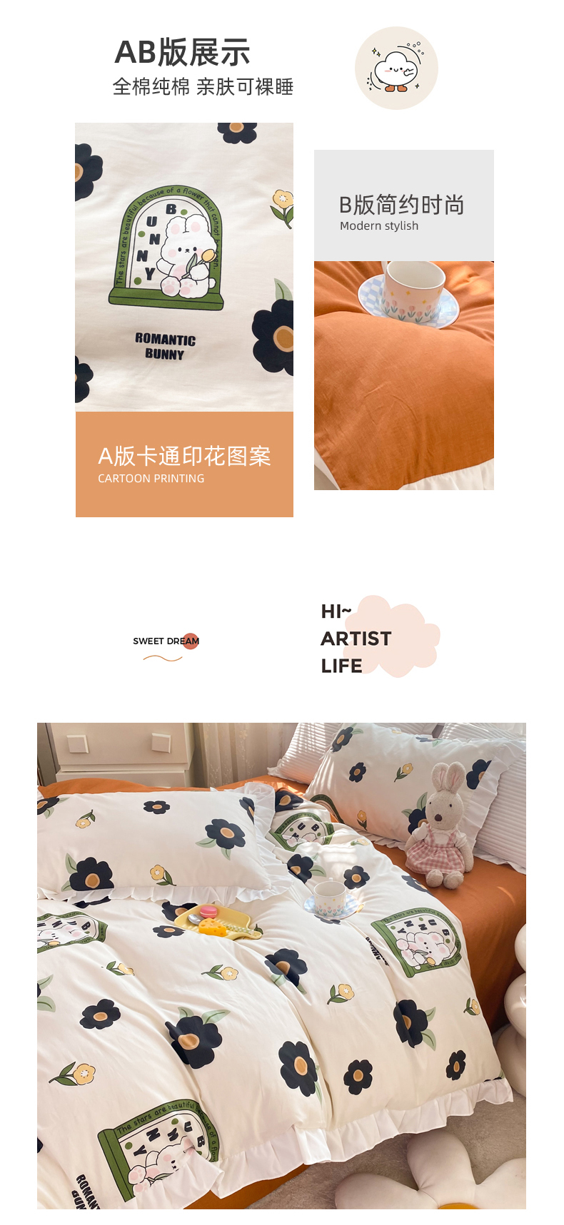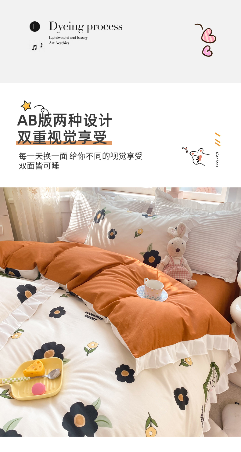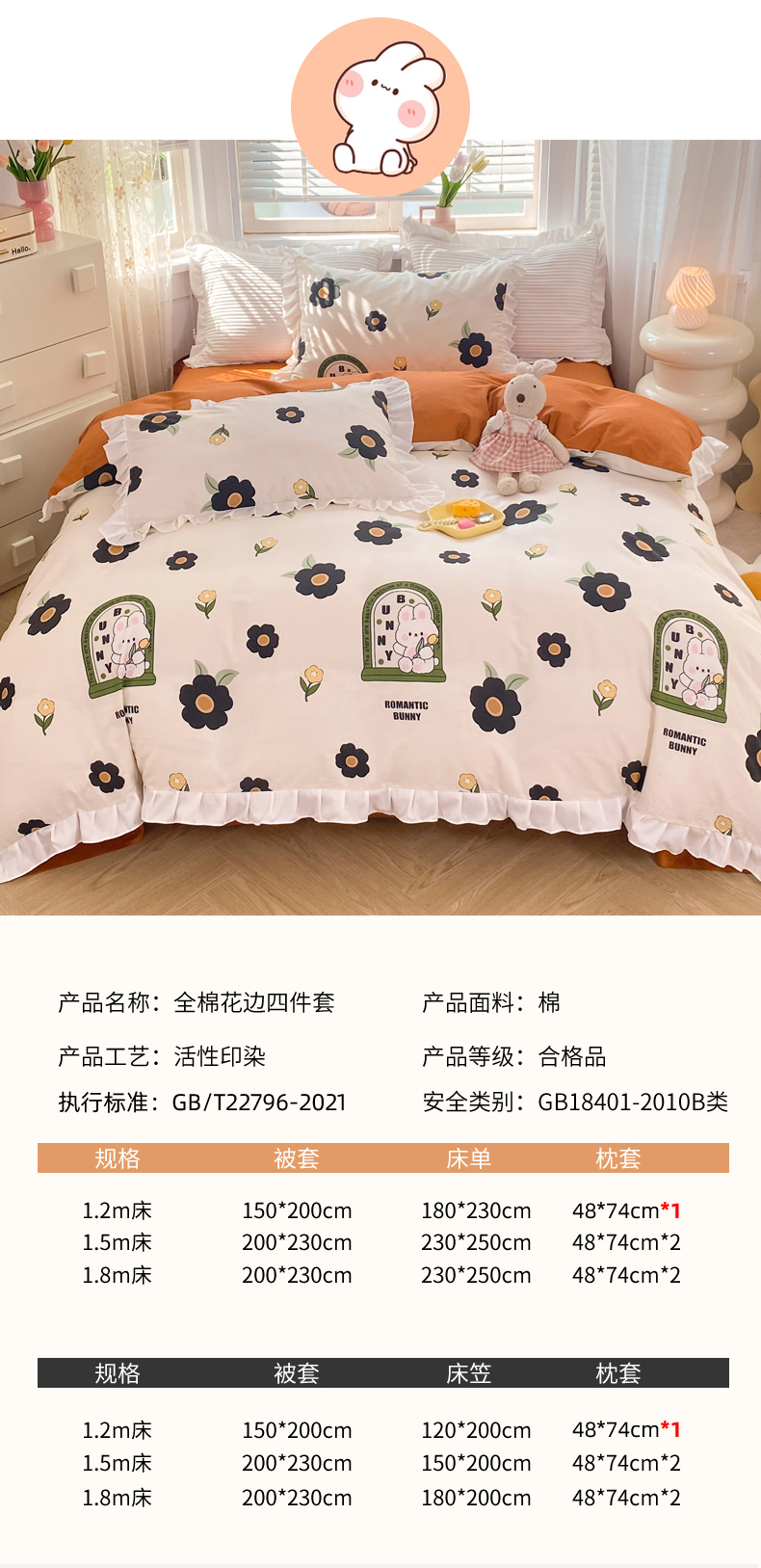 商品名称:玉元坊 2025春夏新款公主风全棉纯棉花边被套床单四件套 邦尼兔