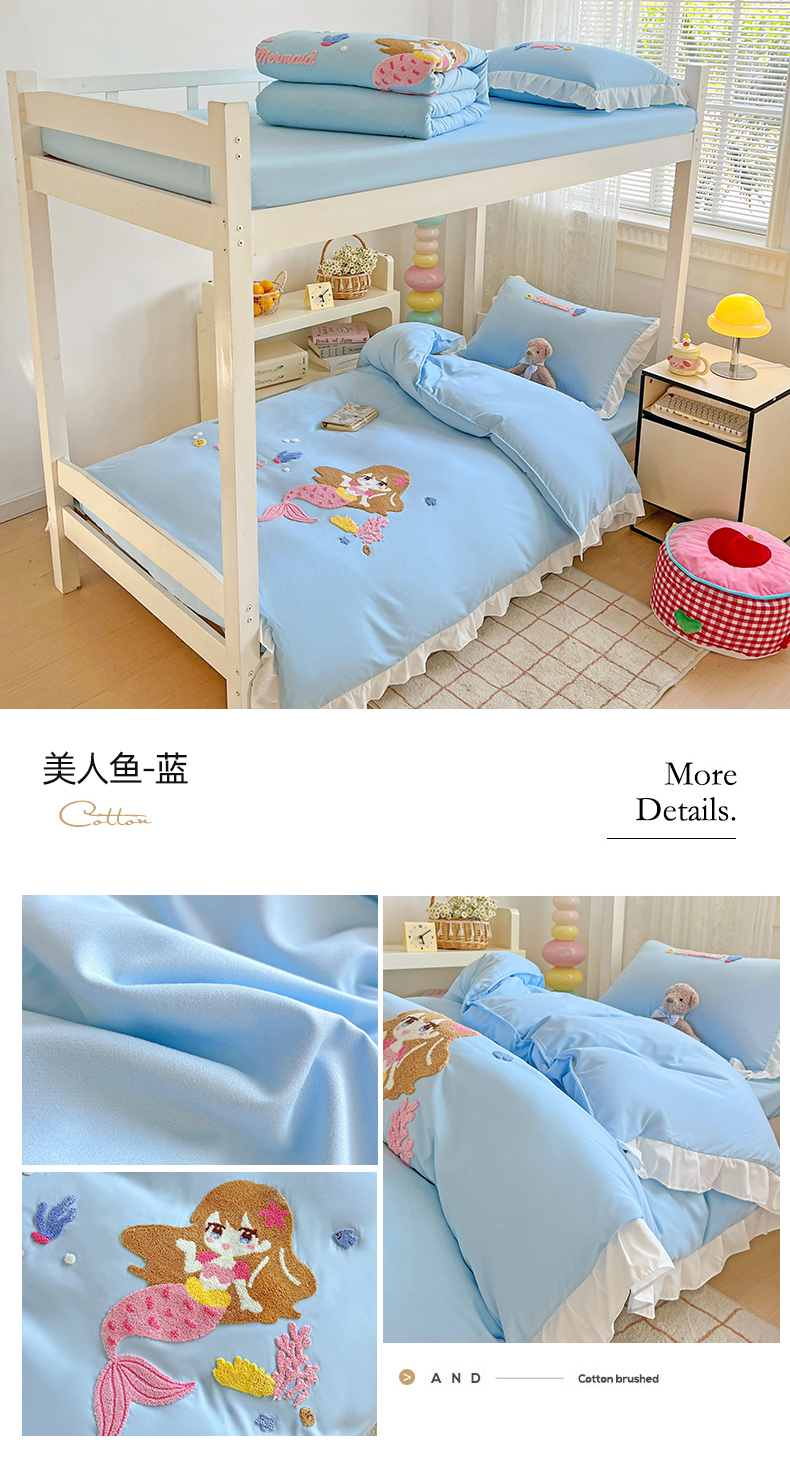 当前位置: 91家纺网 > 商品网购 > 床品套件 > 三件套 > 雨菲家纺 2025新款学生季水洗棉毛巾绣花荷叶花边三件套四件套床单床笠款 美人鱼蓝