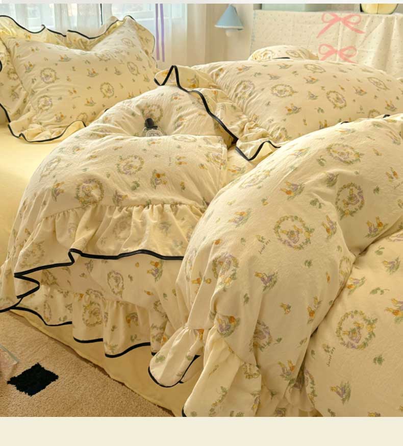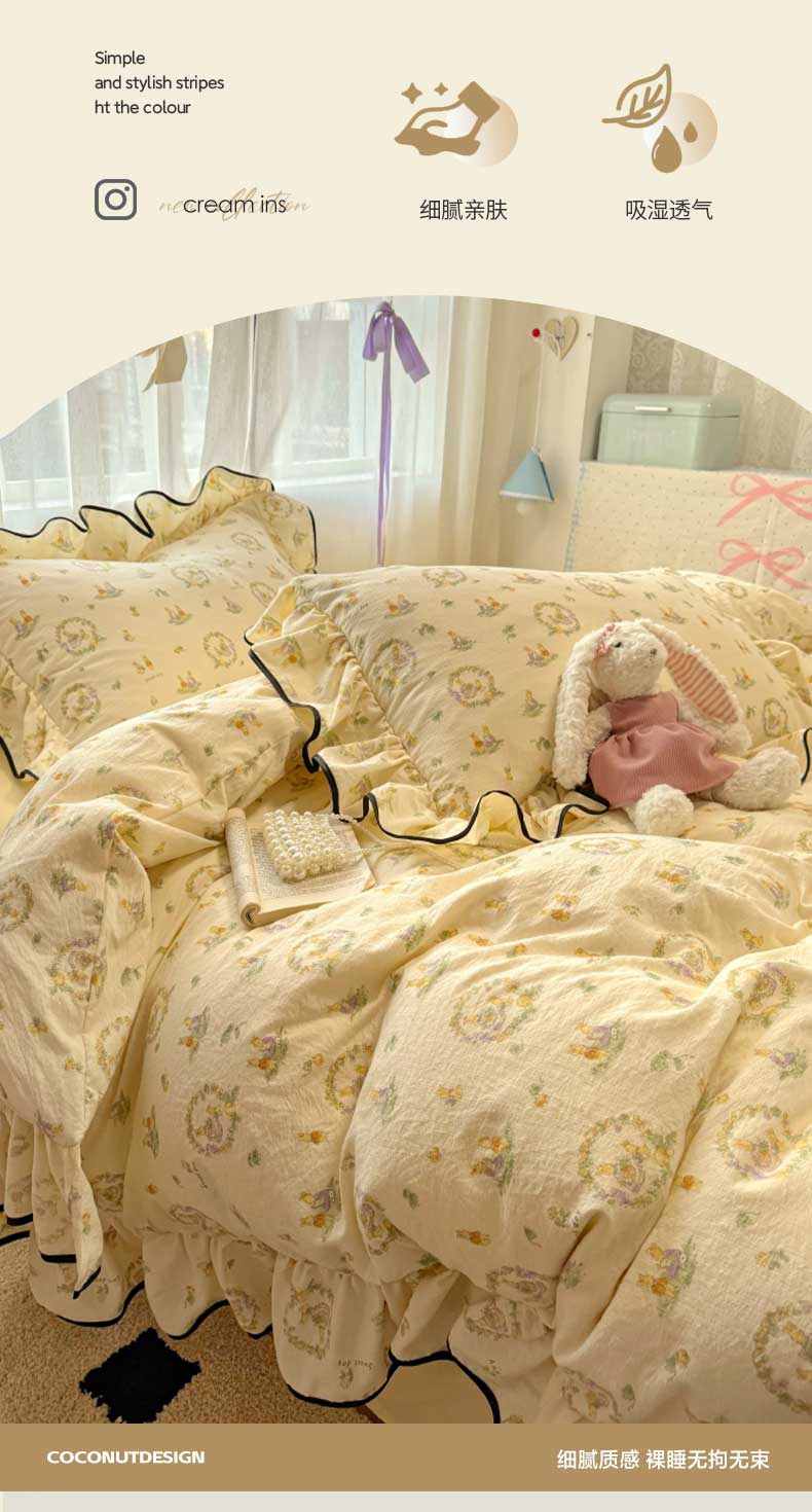当前位置: 91家纺网 > 商品网购 > 床品套件 > 四件套 > 其它四件套 > 繁花家居 2025新款学生季韩式云感针织棉大花边木耳边四件套 花环小兔