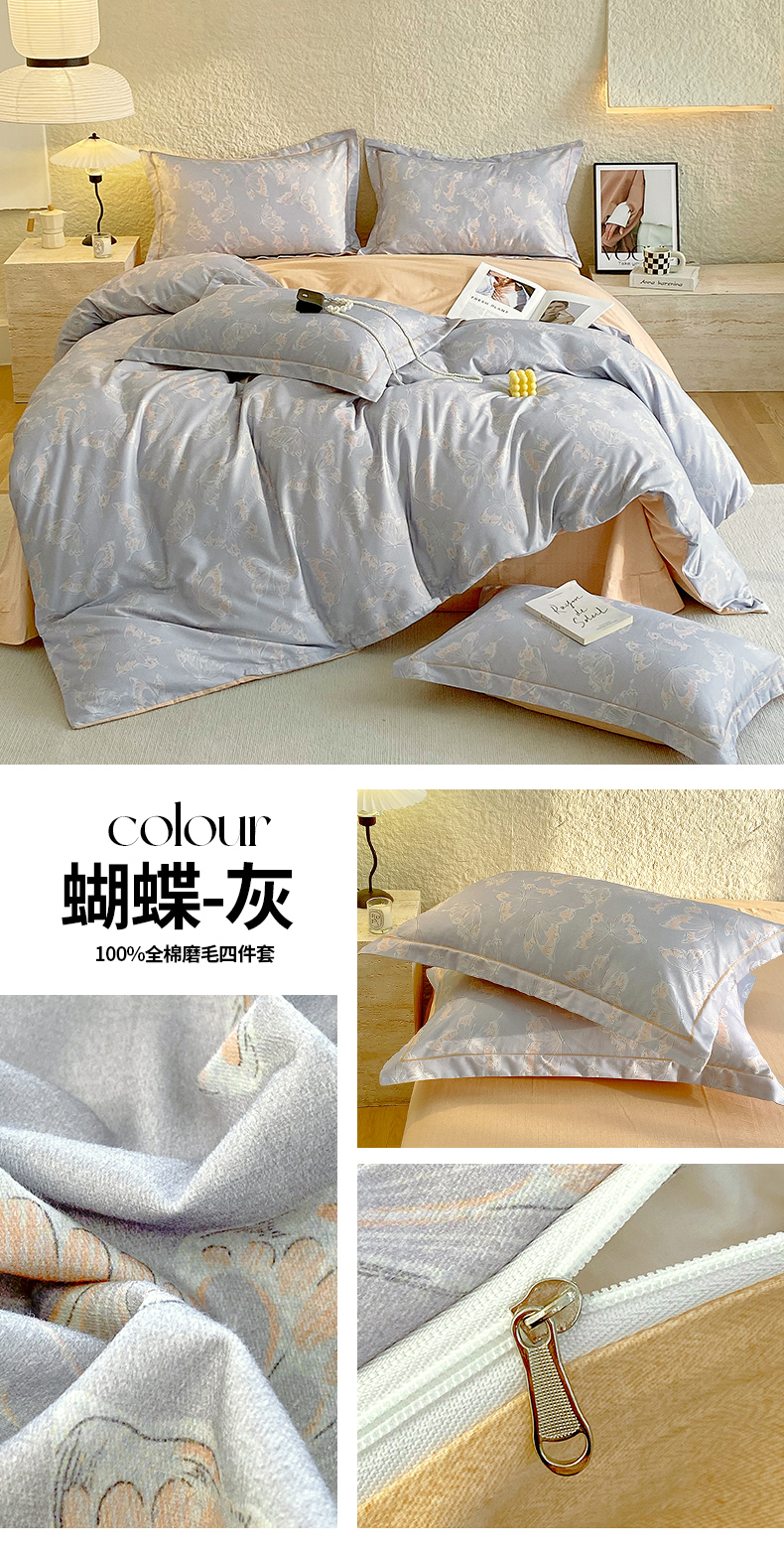 当前位置: 91家纺网 > 商品网购 > 床品套件 > 四件套 > 磨毛活性四件套 > 悦织湾家纺 2025新款100%全棉磨毛四件套加厚加密喷气织造纯棉床上用品印花卡通小清新 蝴蝶-灰