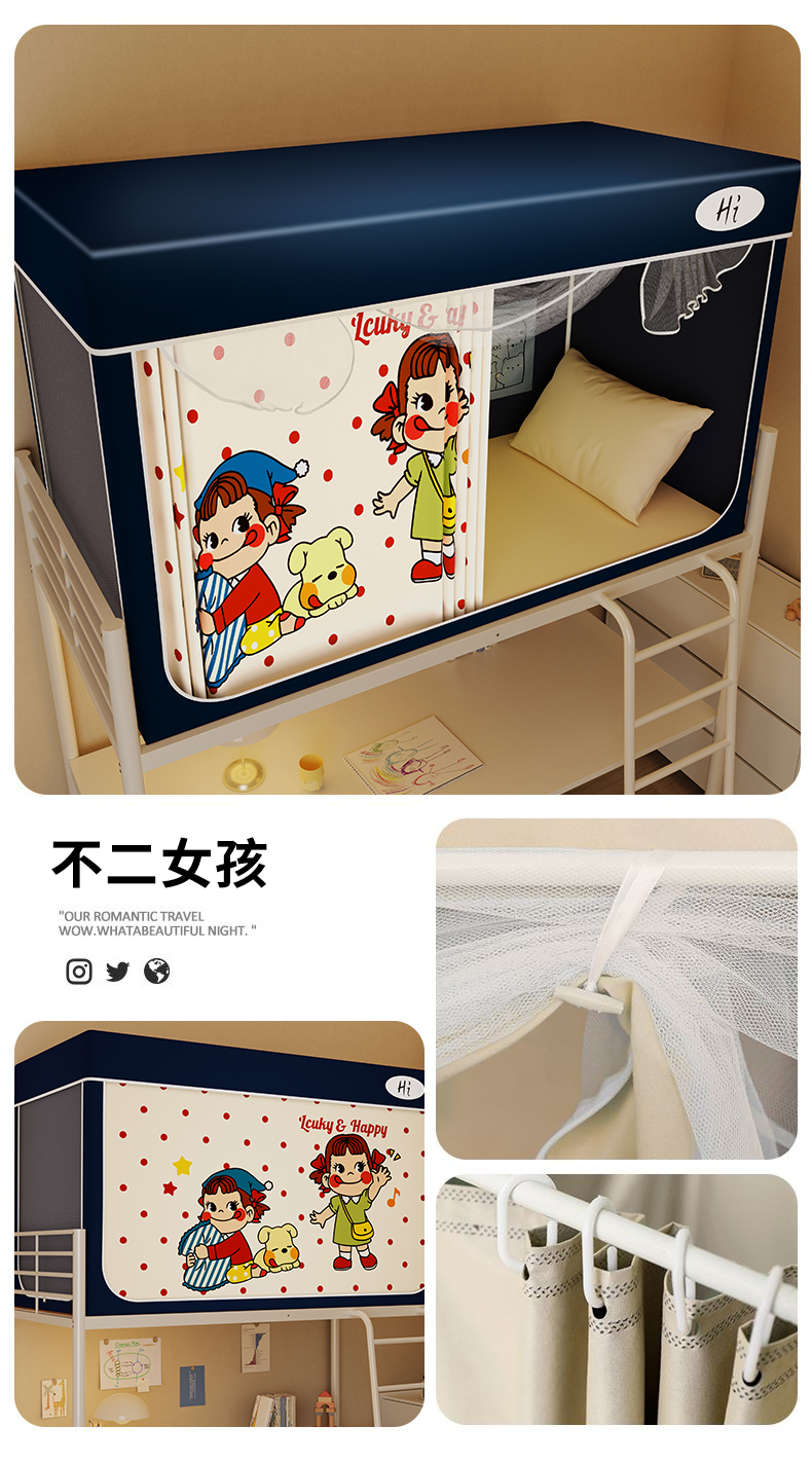 当前位置: 91家纺网 > 商品网购 > 床上用品 > 蚊帐 > 学生蚊帐 > 安金蚊帐2025新款防蚊遮光一体99%强遮光学生宿舍上下铺遮光学生蚊帐-藏蓝系列 不二女孩
