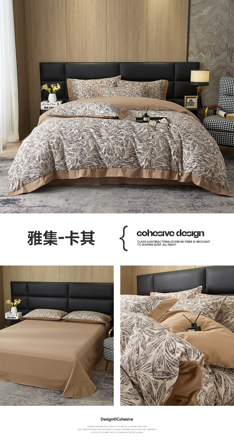 沐白家居 2025新款全棉生态磨毛印花四件套-纽扣工艺款 雅集-卡其