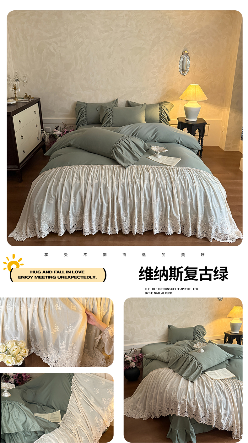 商品名称:吾欢心 2025新款韩版纯棉花边款加厚原棉四件套维纳斯(高端定制) 维纳斯复古绿