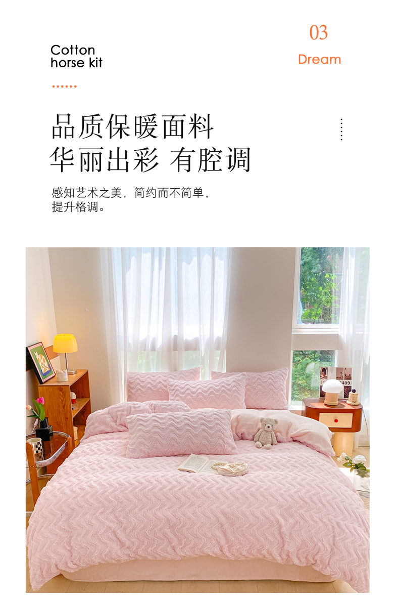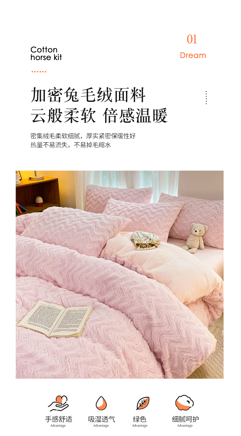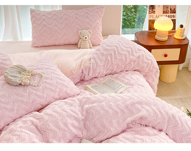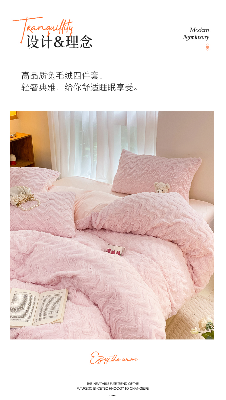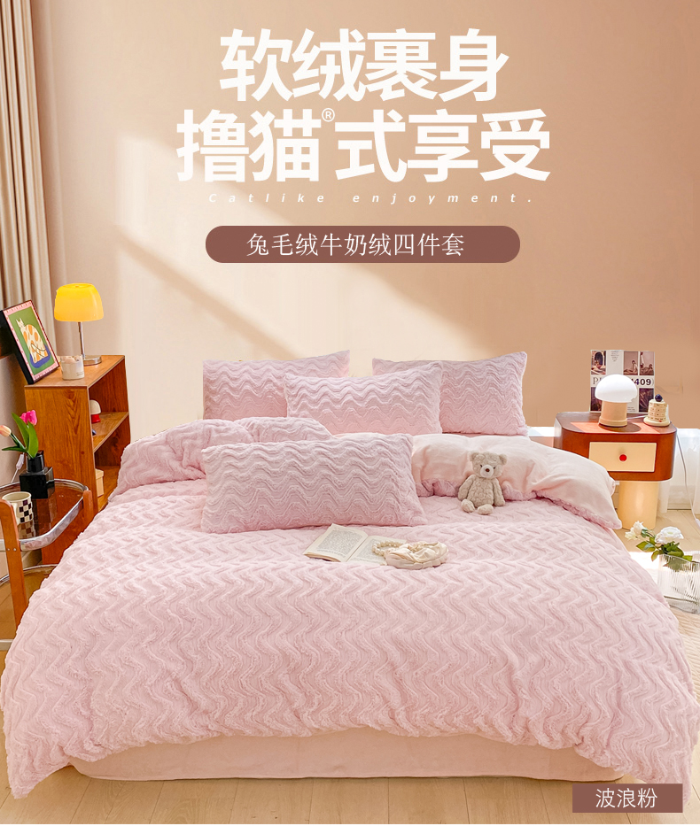 当前位置: 91家纺网 > 商品网购 > 床品套件 > 四件套 > 牛奶绒四件套 > 金爱家 2025新款全消光牛奶绒A类纯色獭兔毛绒立体牛奶绒四件套 兔毛波浪粉