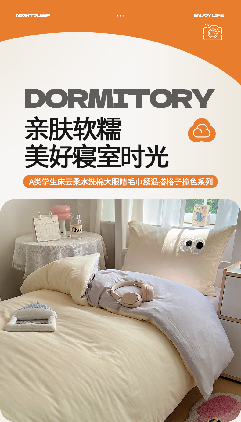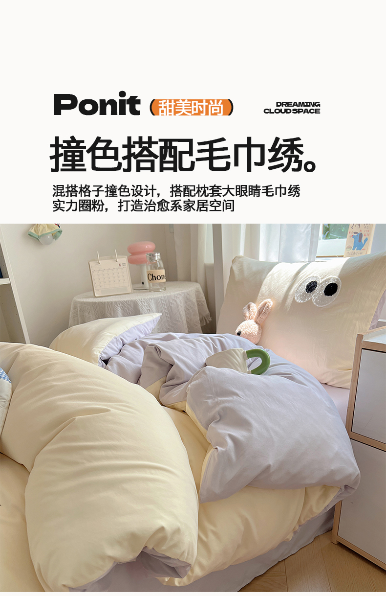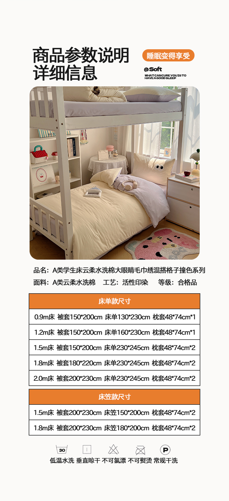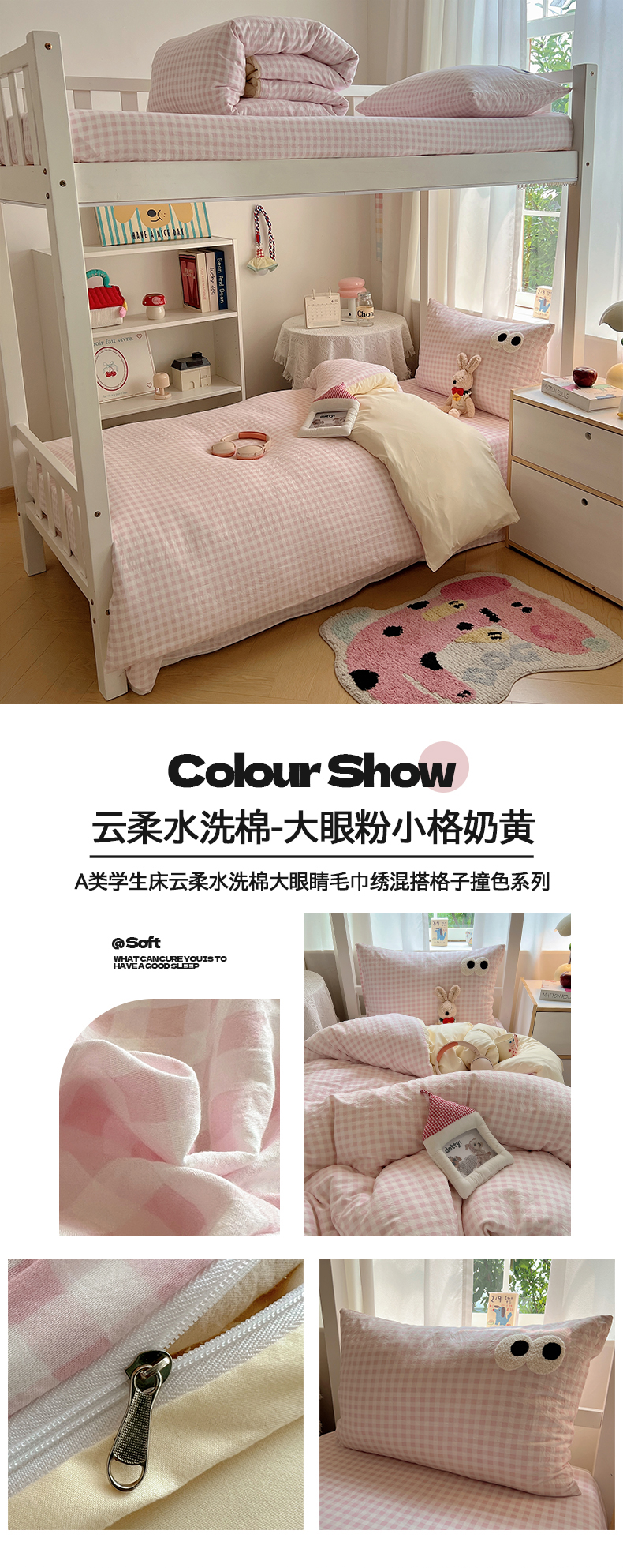 当前位置: 91家纺网 > 商品网购 > 床品套件 > 三件套 > 桃心家居 2025新款A类学生床三件套亲肤舒适软糯云柔水洗棉大眼睛毛巾绣混搭格子撞色系列四件套 云柔水洗棉-大眼奶油葡萄