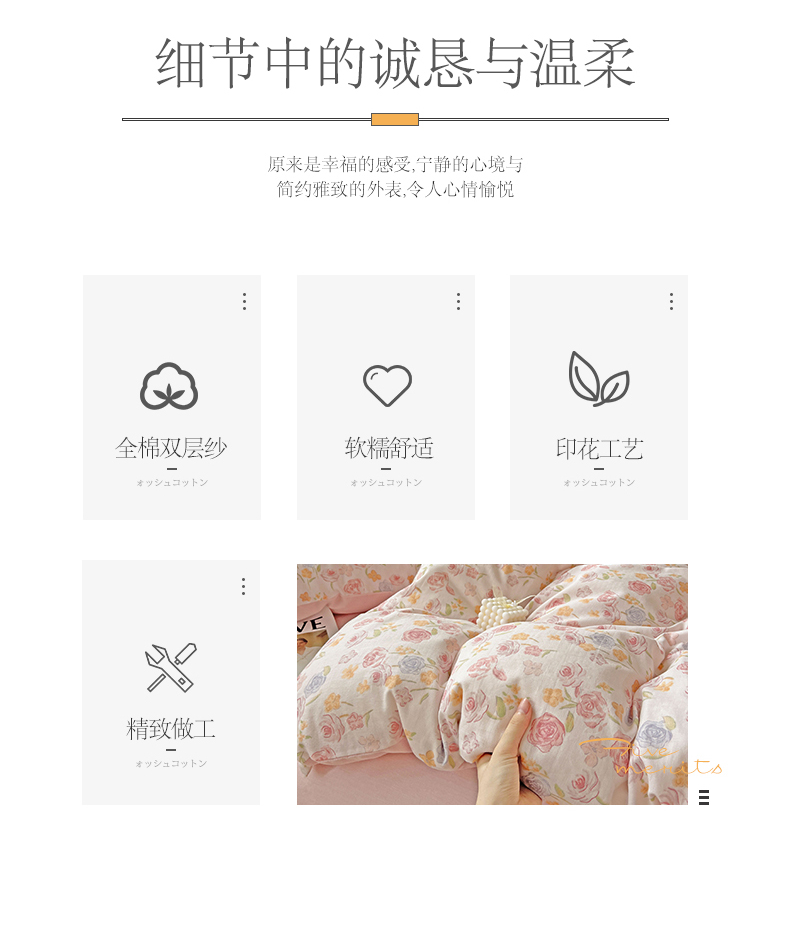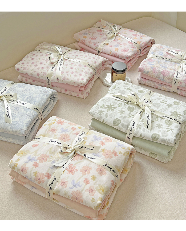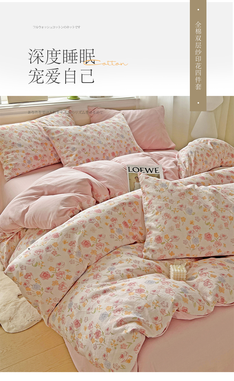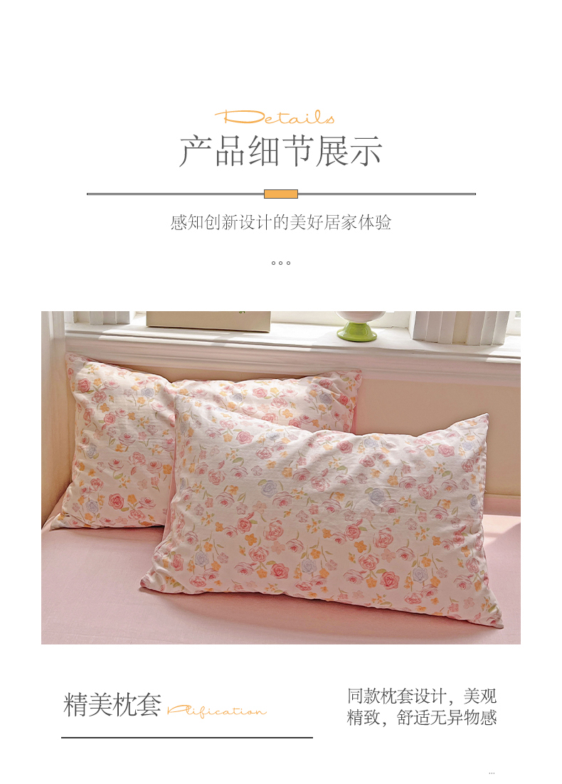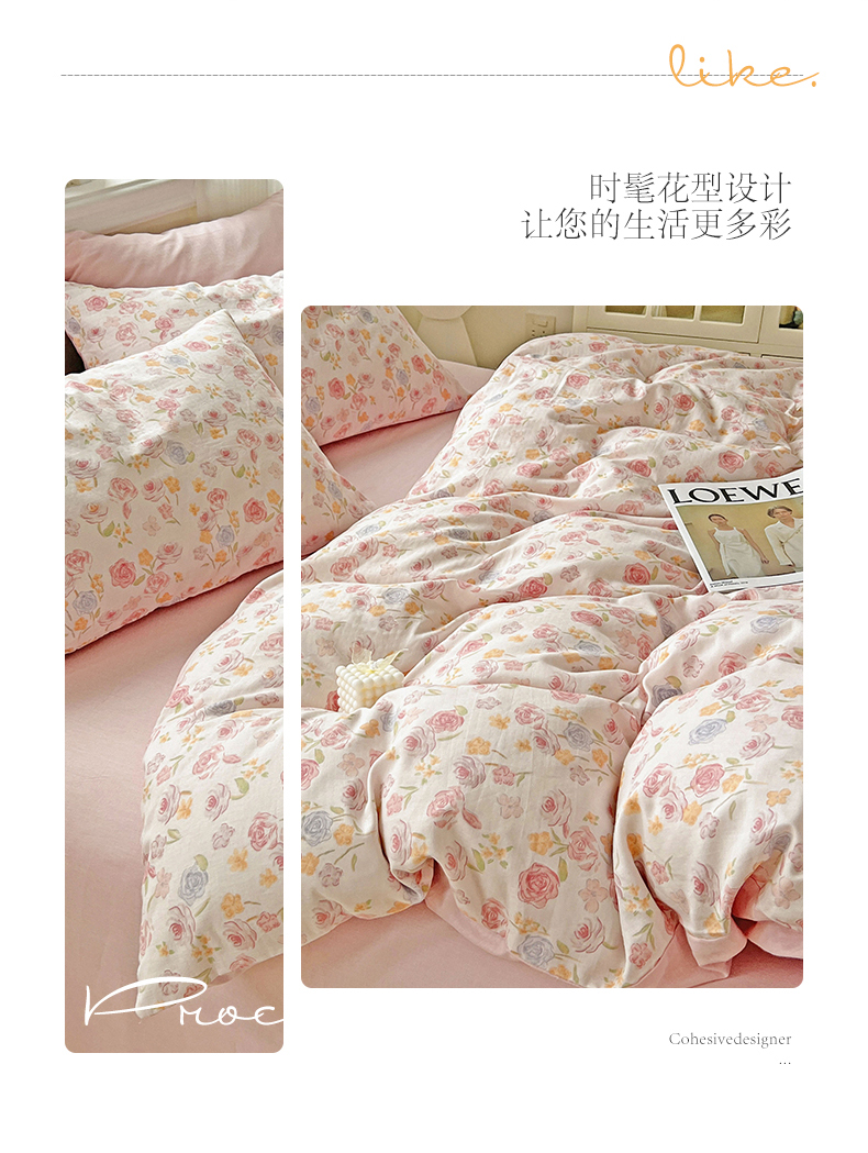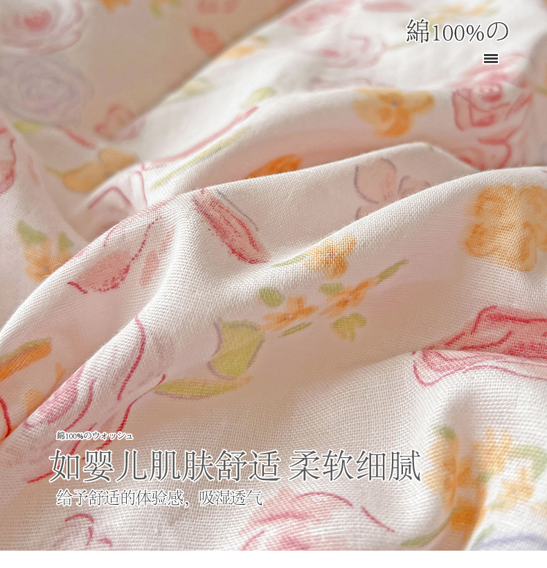 商品名称:小懒猪 2025新款全棉有氧有氧双层纱清新印花四件套 玫瑰花语