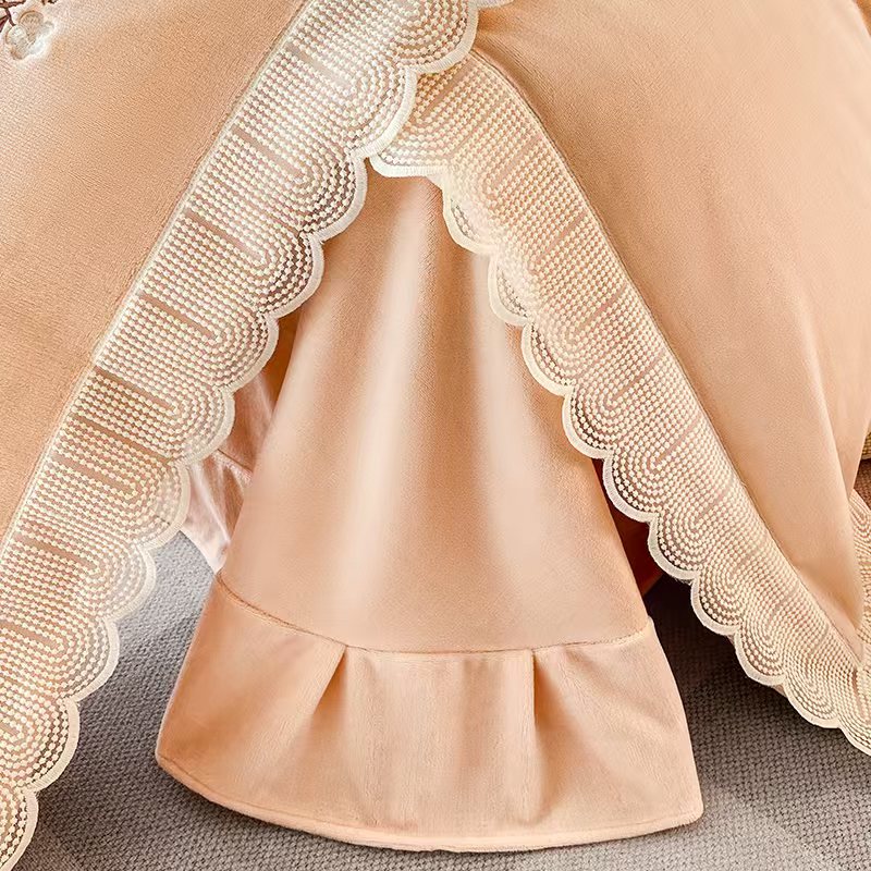 2025新款公主风雷斯花边刺绣牛奶绒四件套 少女风-卡其玉