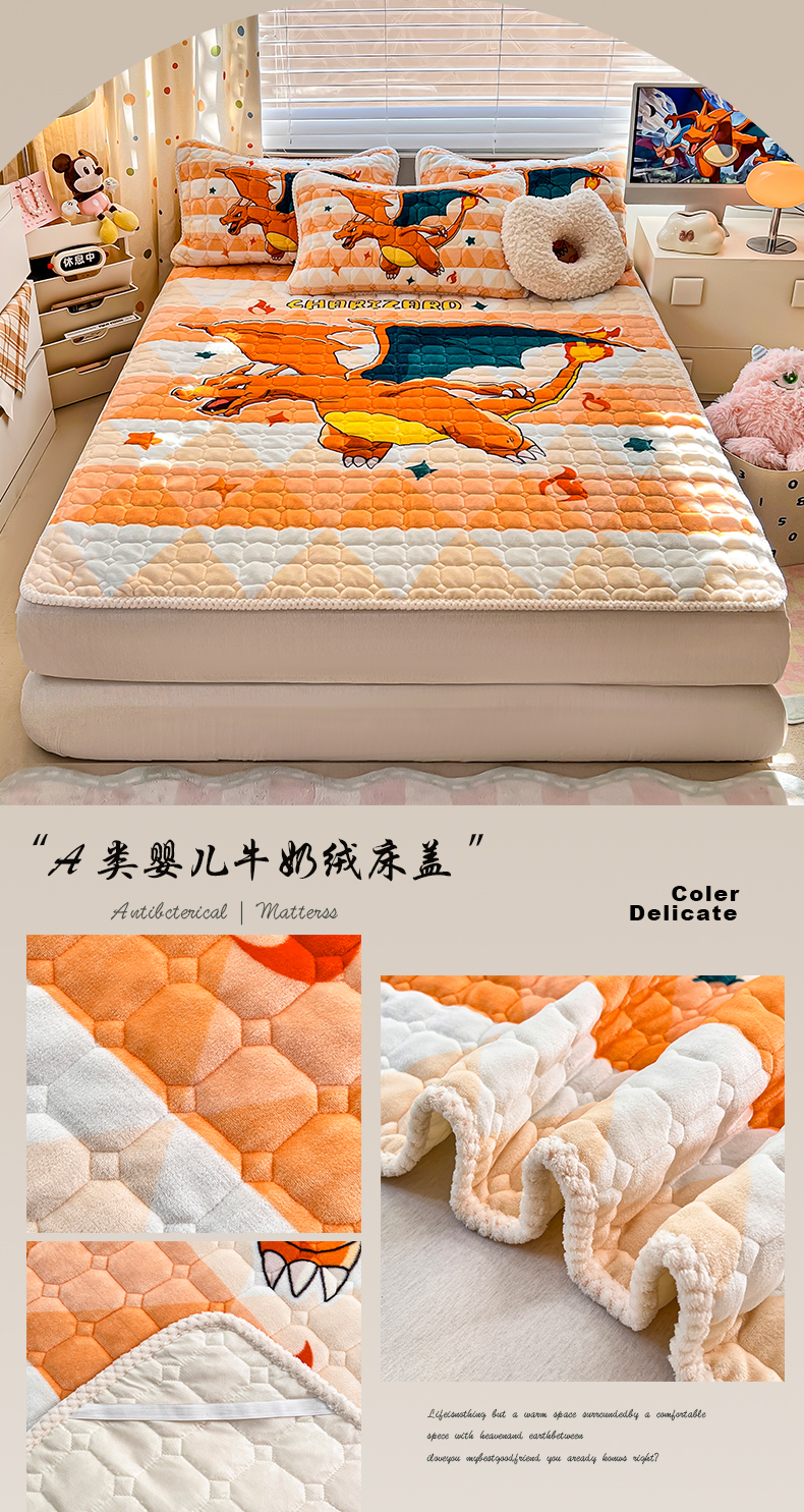 (总)徕米家居 2025新款牛奶绒加棉床笠单品床笠单件单床笠,Q版皮卡丘,波点皮卡丘,大版大耳狗,大版库洛米,大版美乐蒂,大版喷火龙,欢乐帕恰狗,杰尼龟,皮卡丘伙伴,小火龙