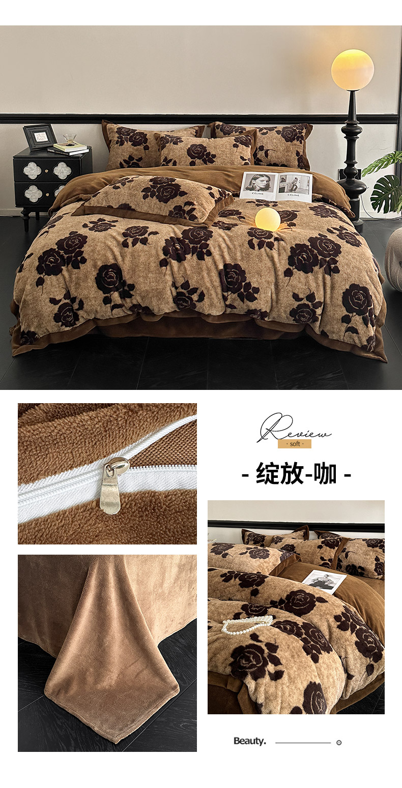 商品名称:绒世界 2025秋冬新款丹麦绒宽边牛奶绒四件套 宽边兔绒-绽放-咖