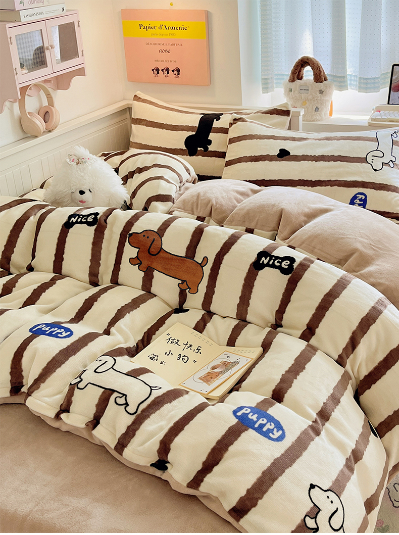 商品名称:桃子家居 2025新款A类ins小清新少女奶油卡通可爱加厚牛奶绒四件套 绒-条纹小腊肠