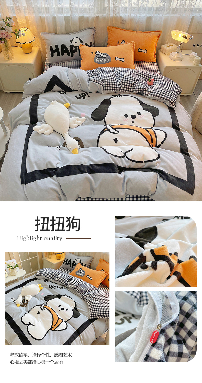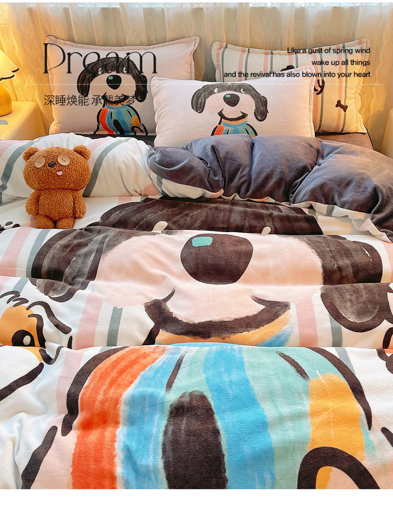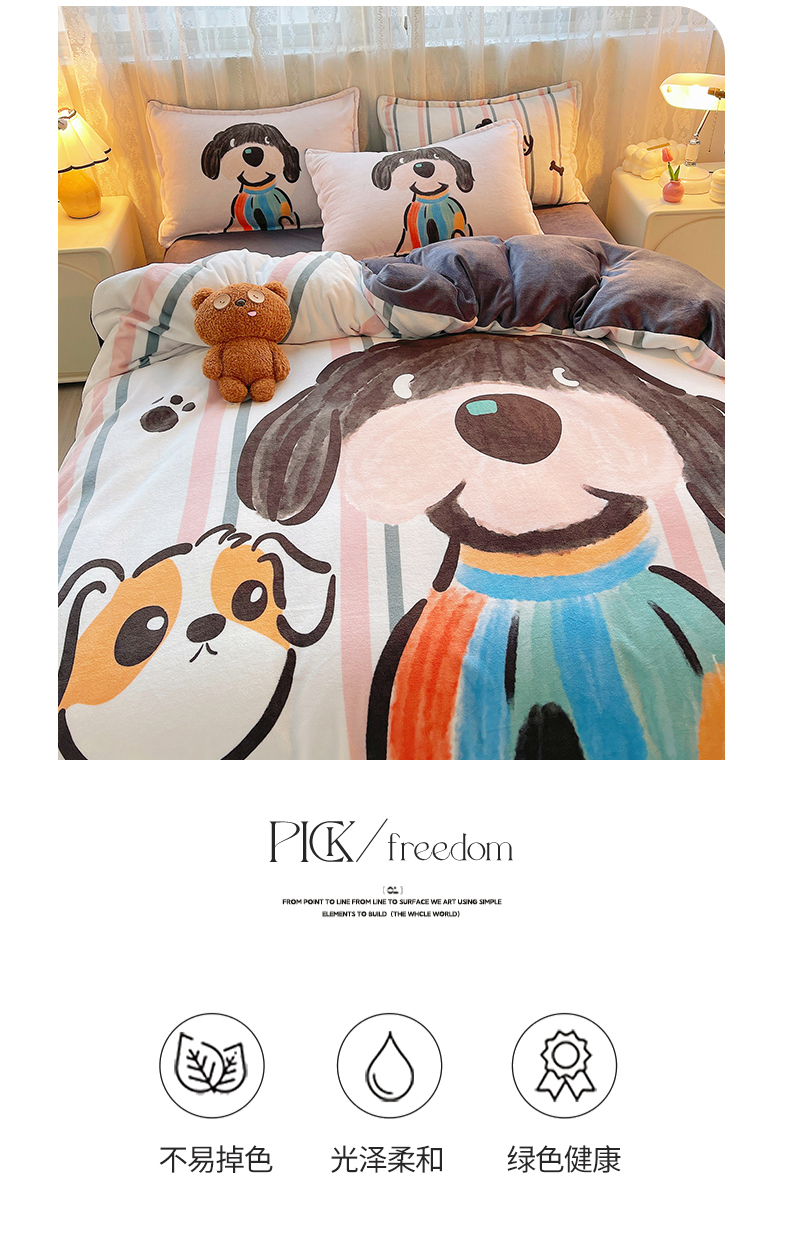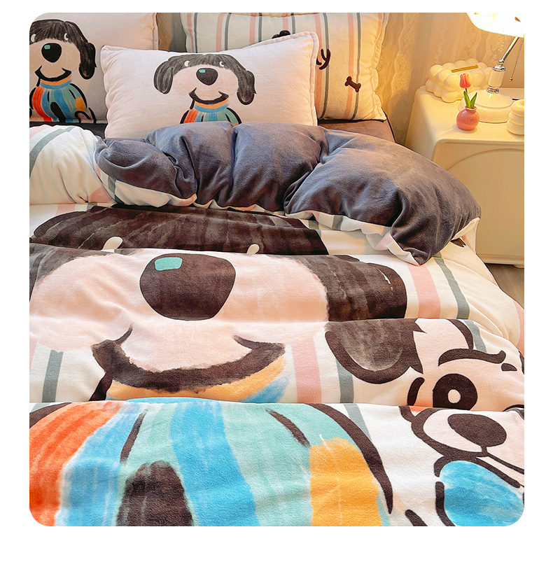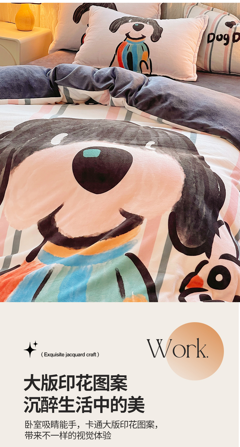 (总)炫拼家纺 2025新款大版数码印花卡通高克重牛奶绒四件套,乔治汪汪,快乐小象,熊和兔,啵啵熊,扭扭狗,苹果狗,豹纹兔兔,泡泡狗,搞怪兔兔,向钱看,元气企鹅