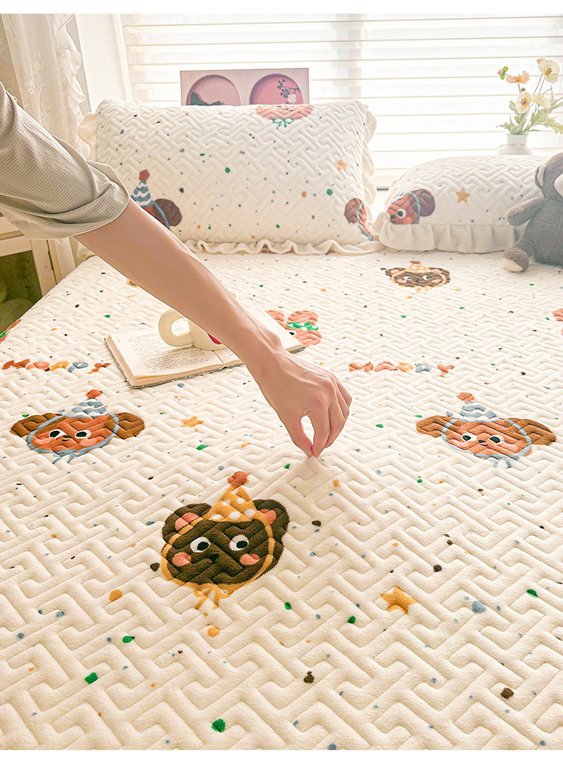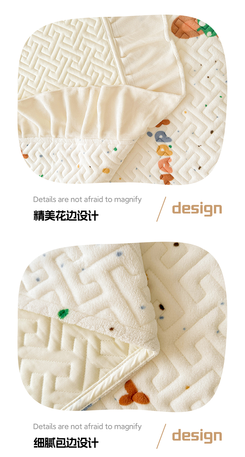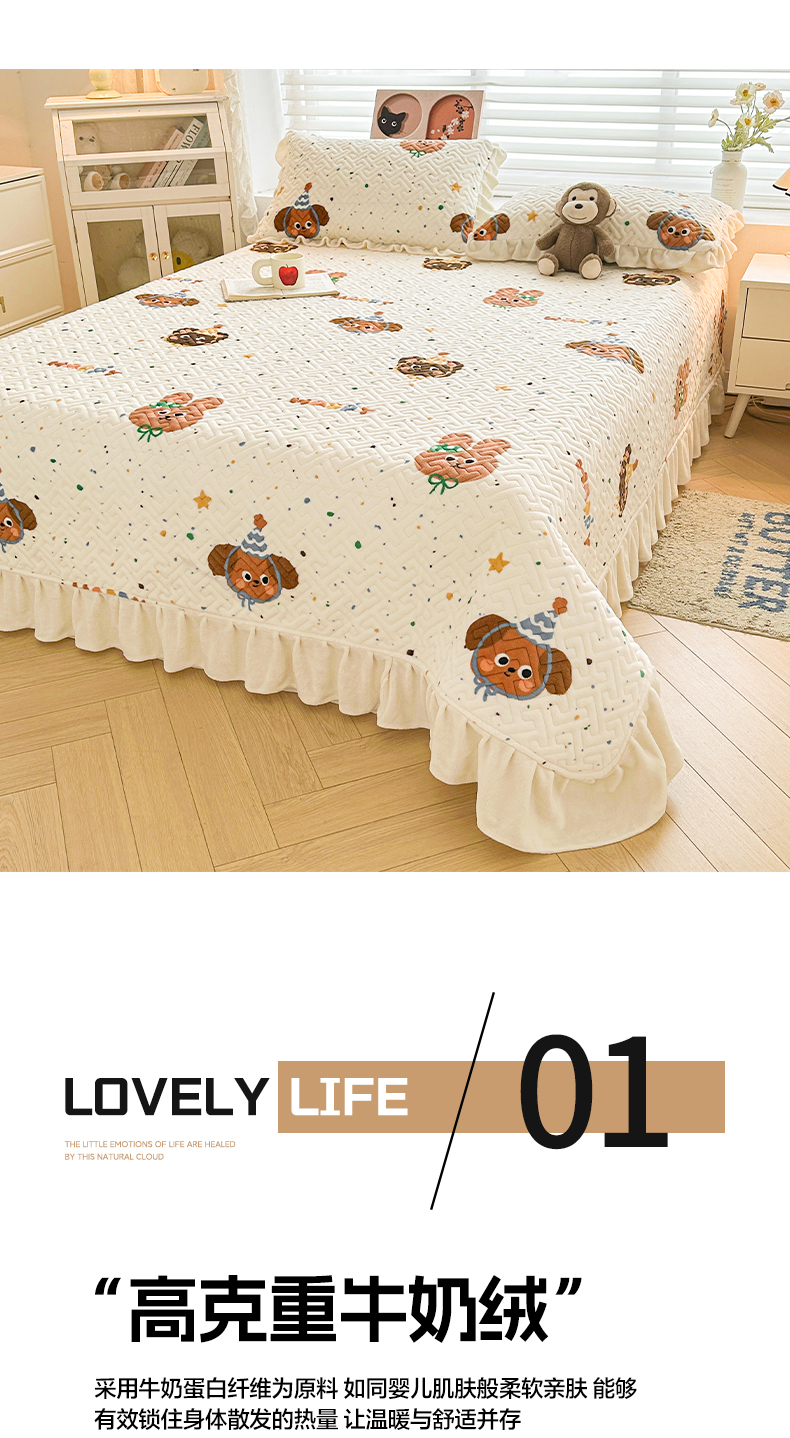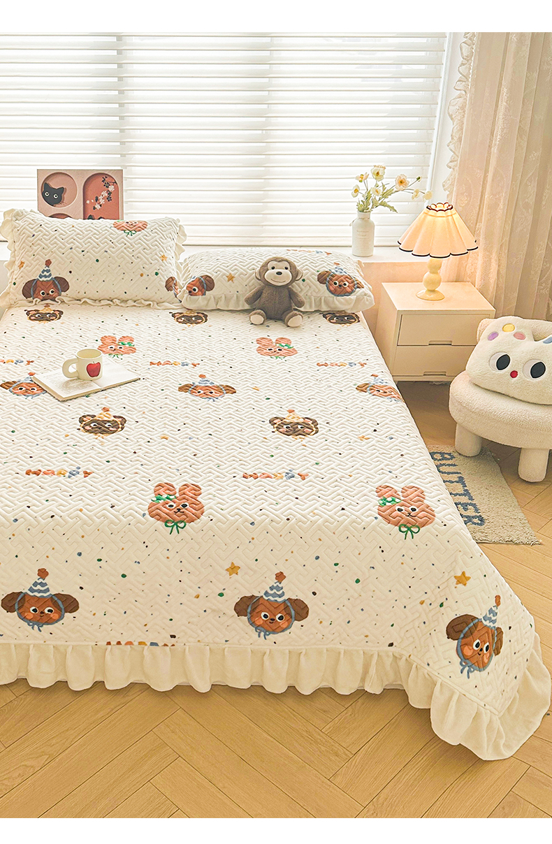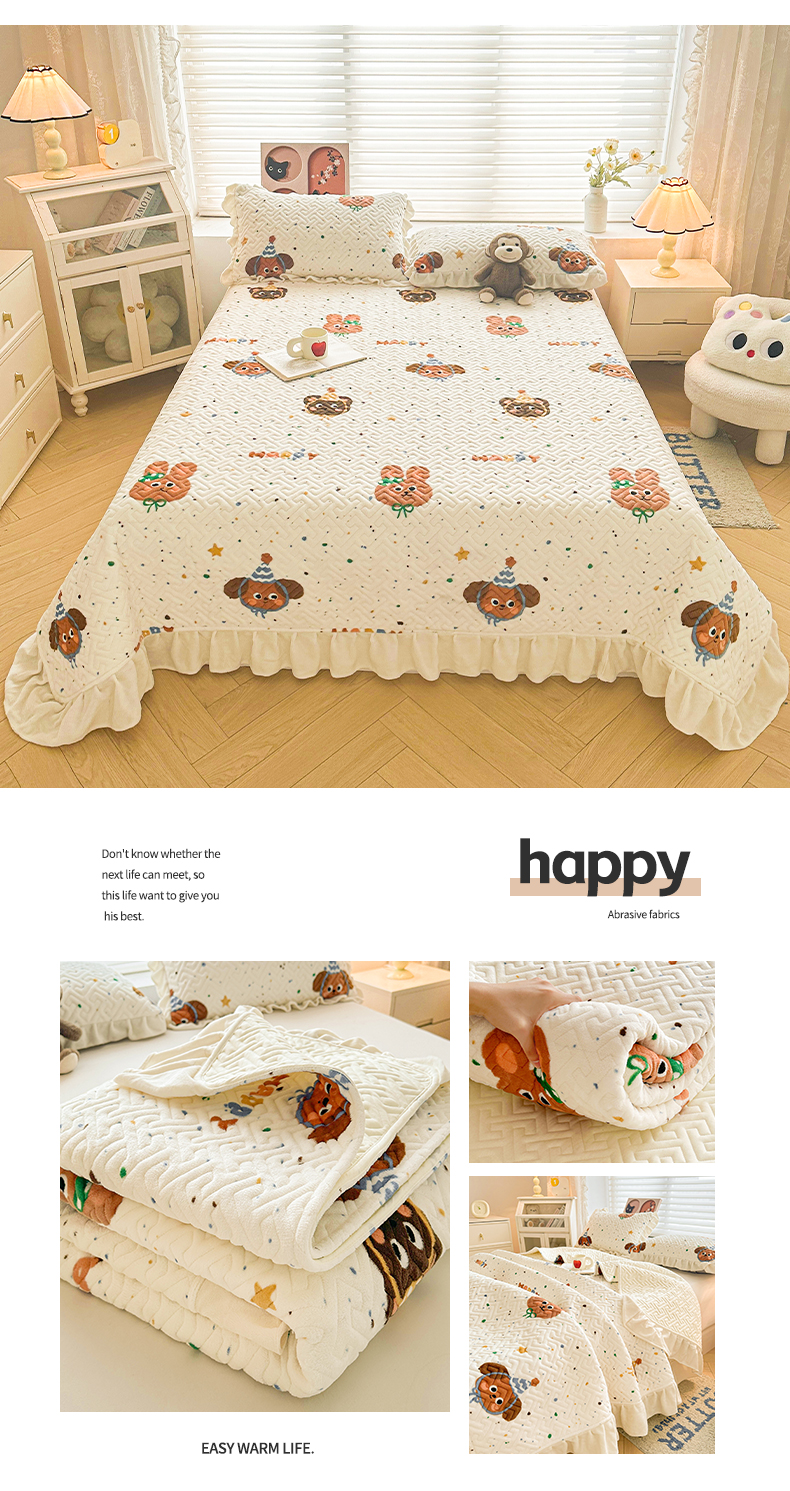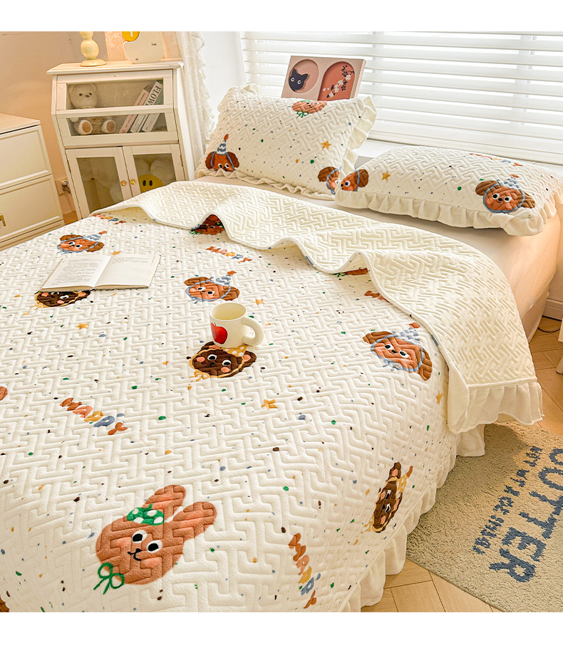 商品名称:凯罗 2025新款牛奶绒花边床盖印花小清新盖毯加大牛奶绒床盖床单 happy