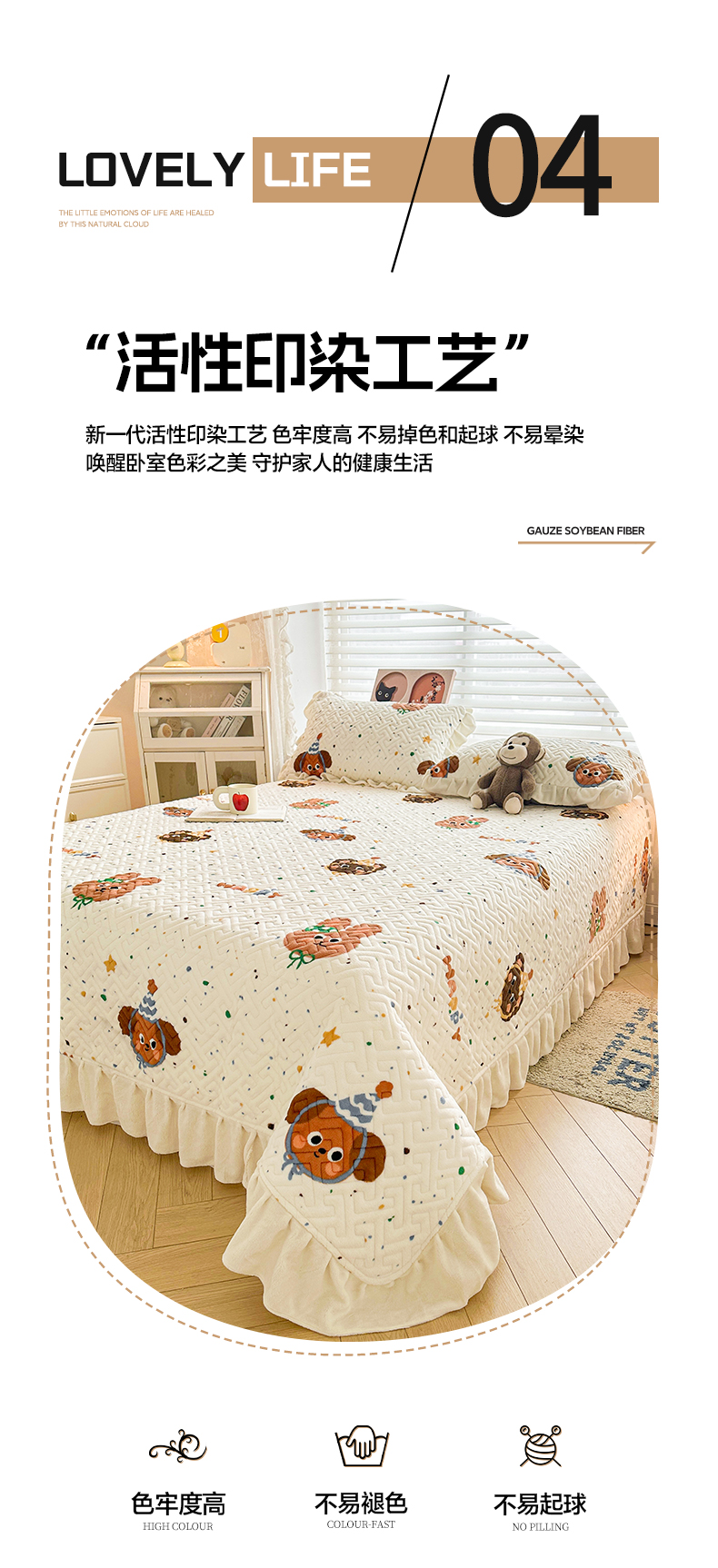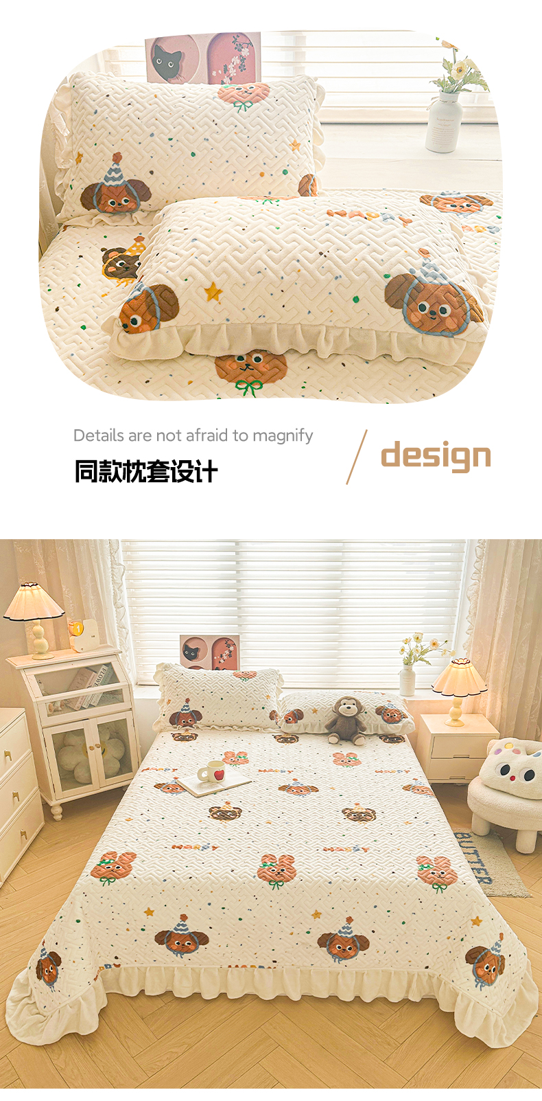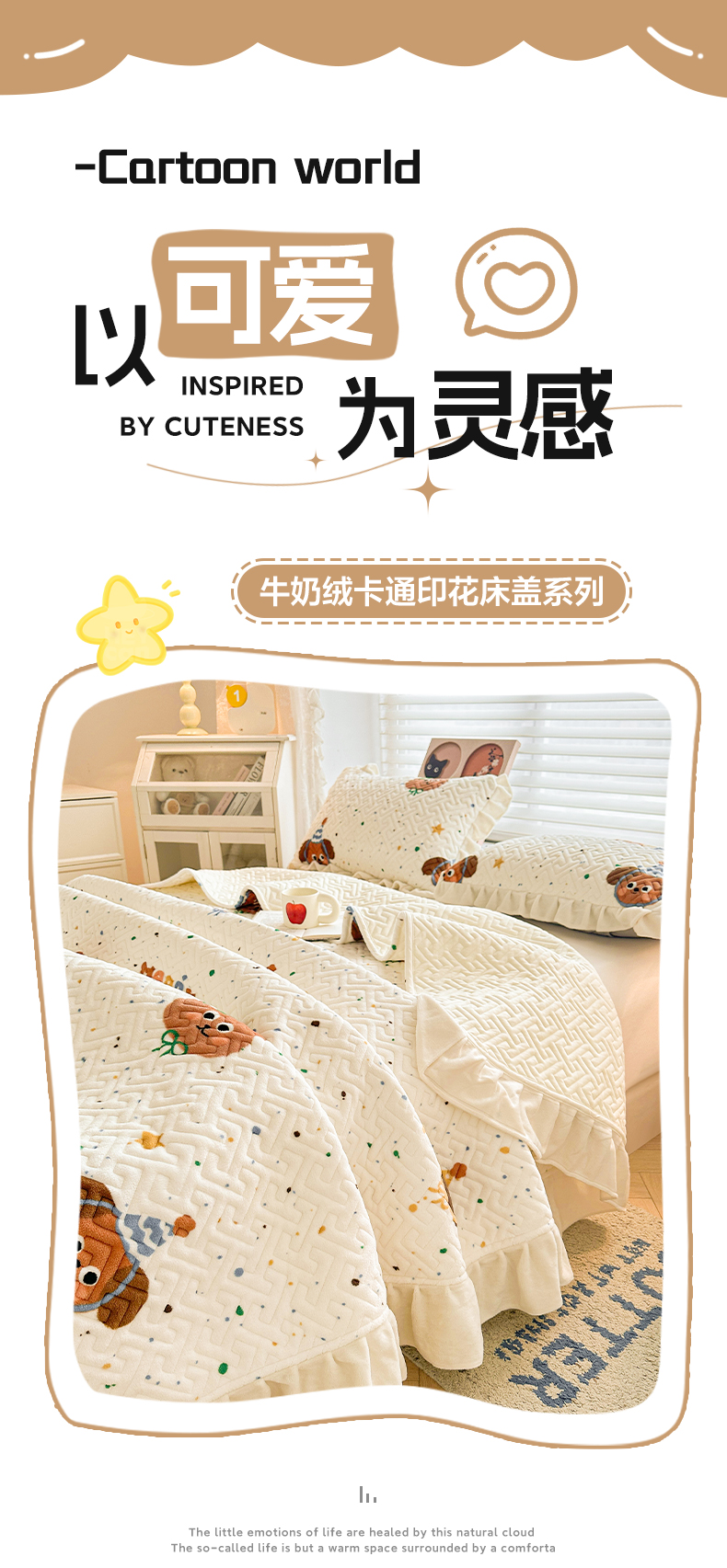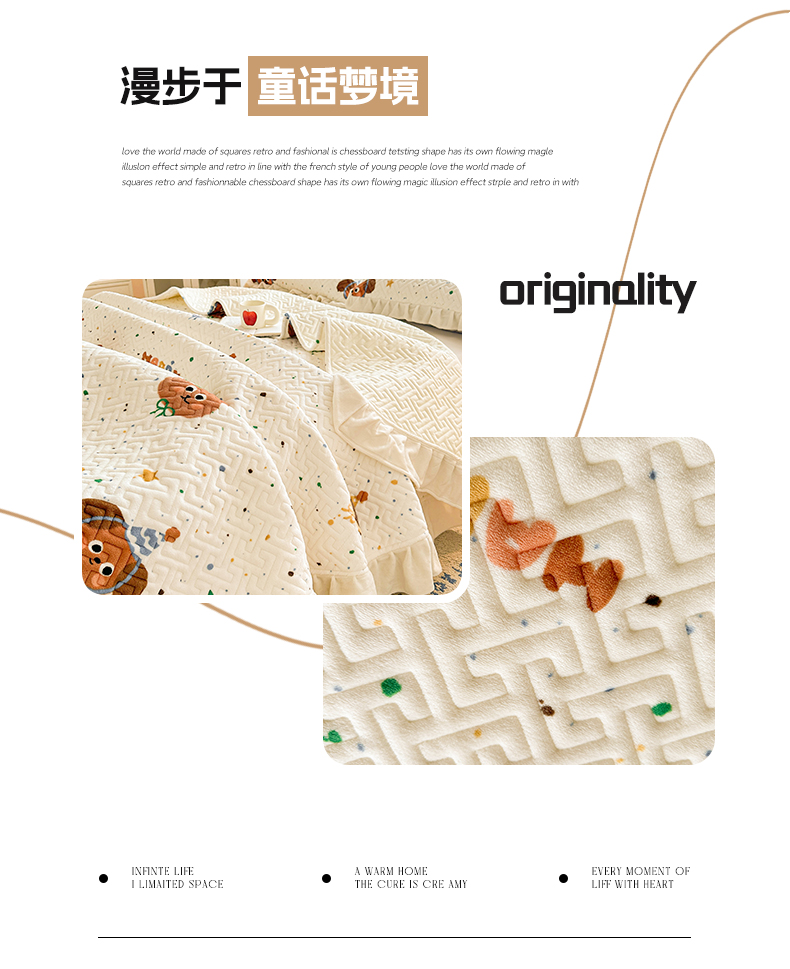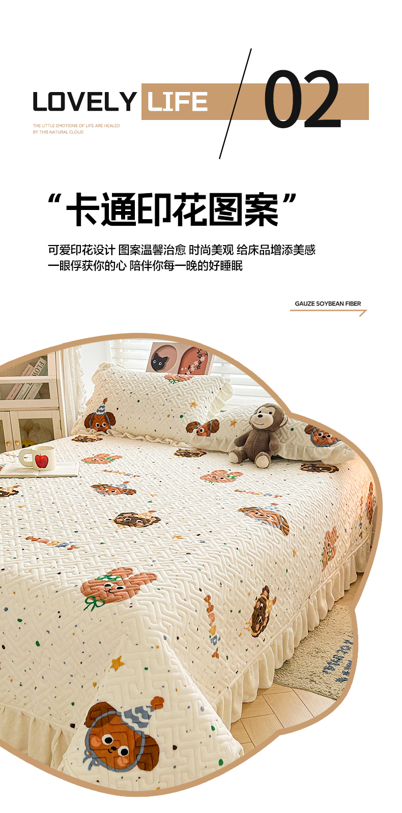 商品名称:凯罗 2025新款牛奶绒花边床盖印花小清新盖毯加大牛奶绒床盖床单 happy