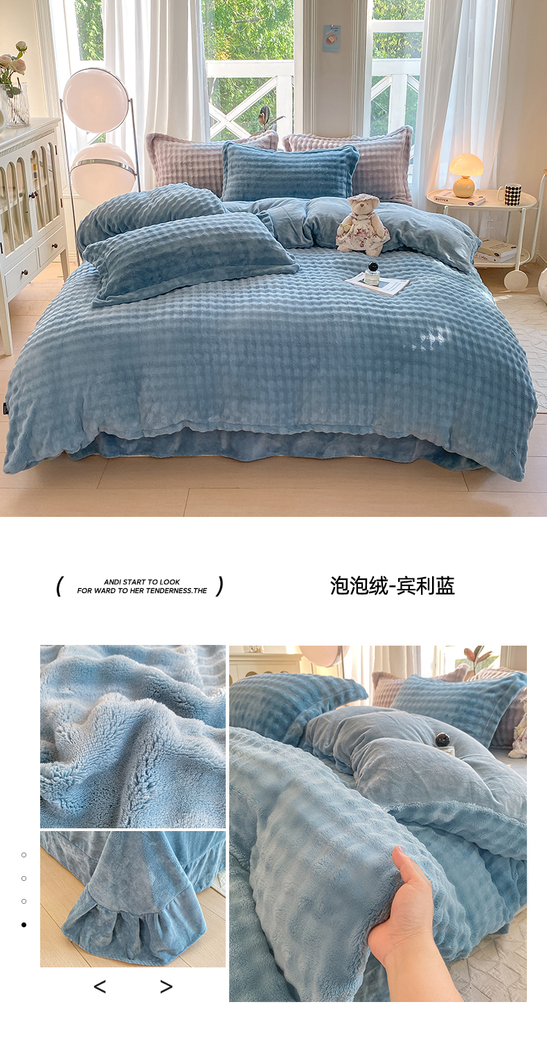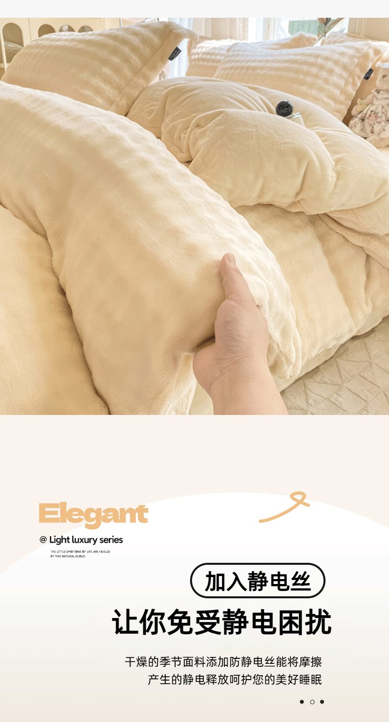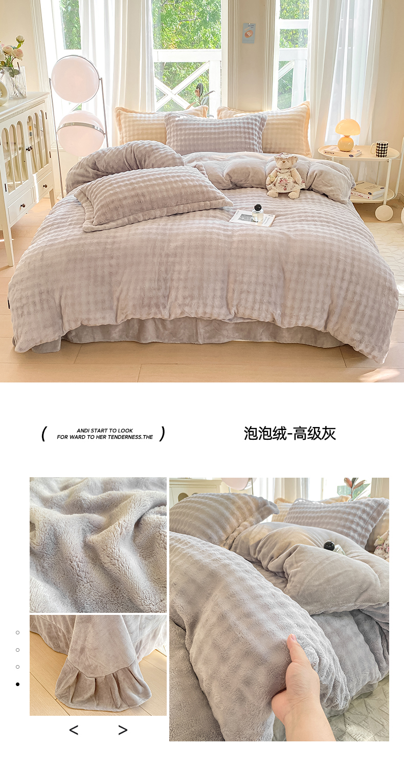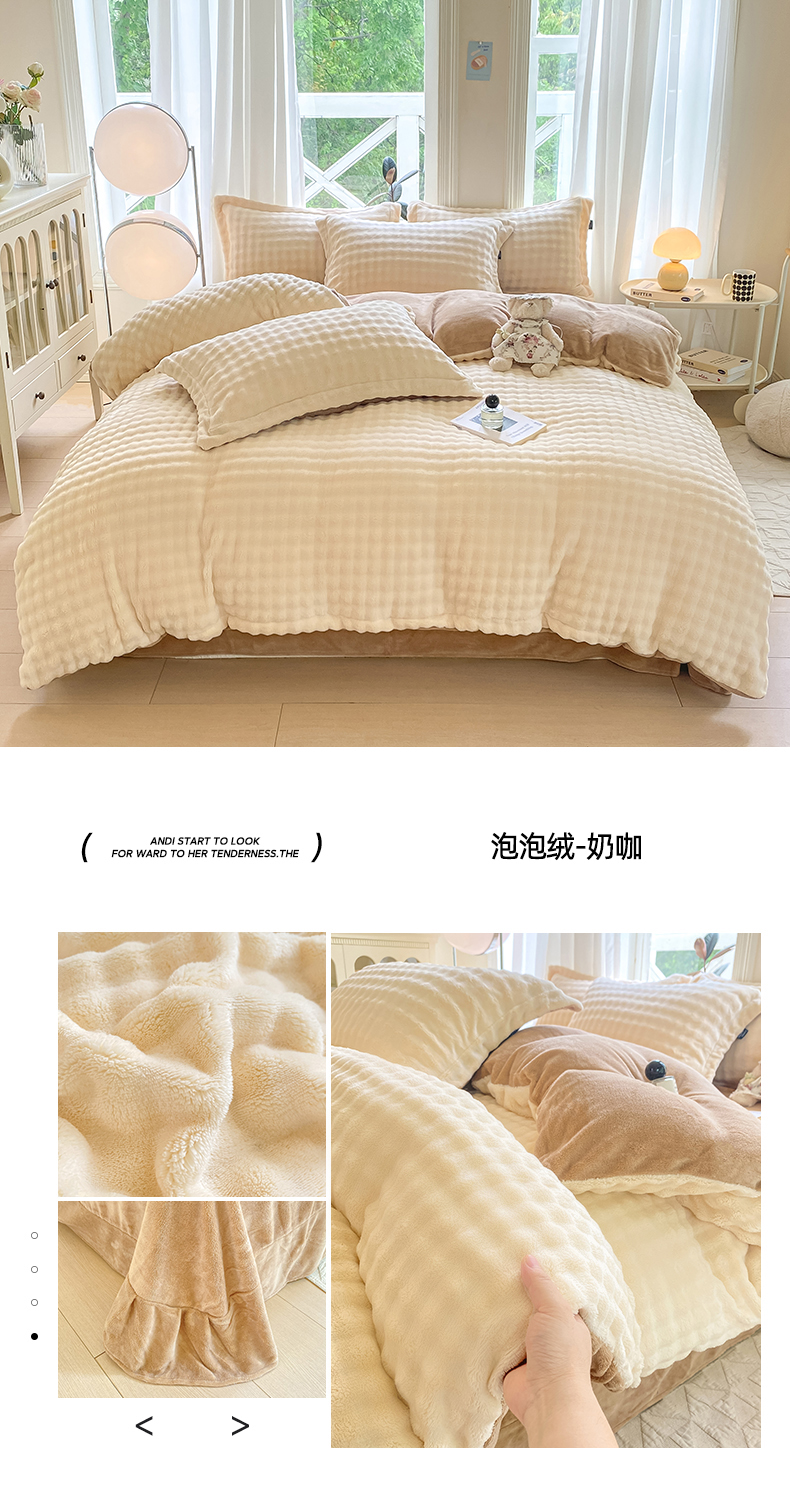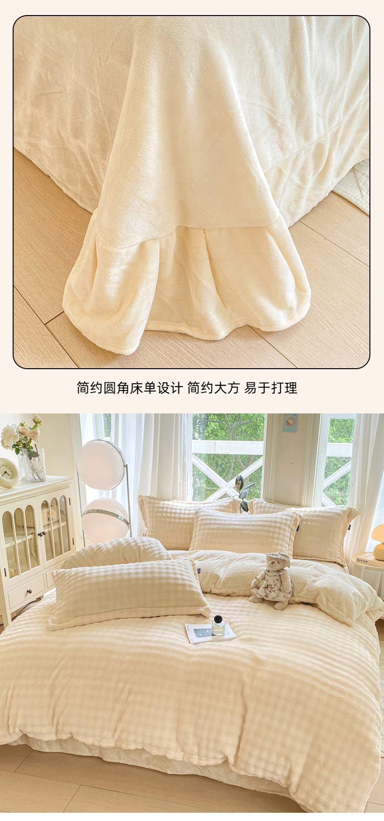 悦织湾家纺 2025新款泡泡绒仿兔毛绒四件套牛奶绒纯色轻奢床上用品4件套货源足 泡泡绒-米白