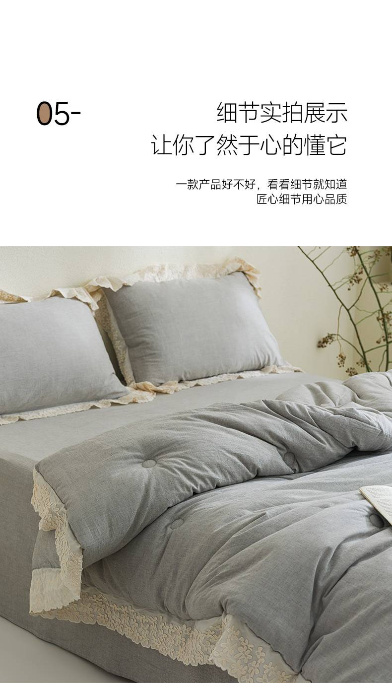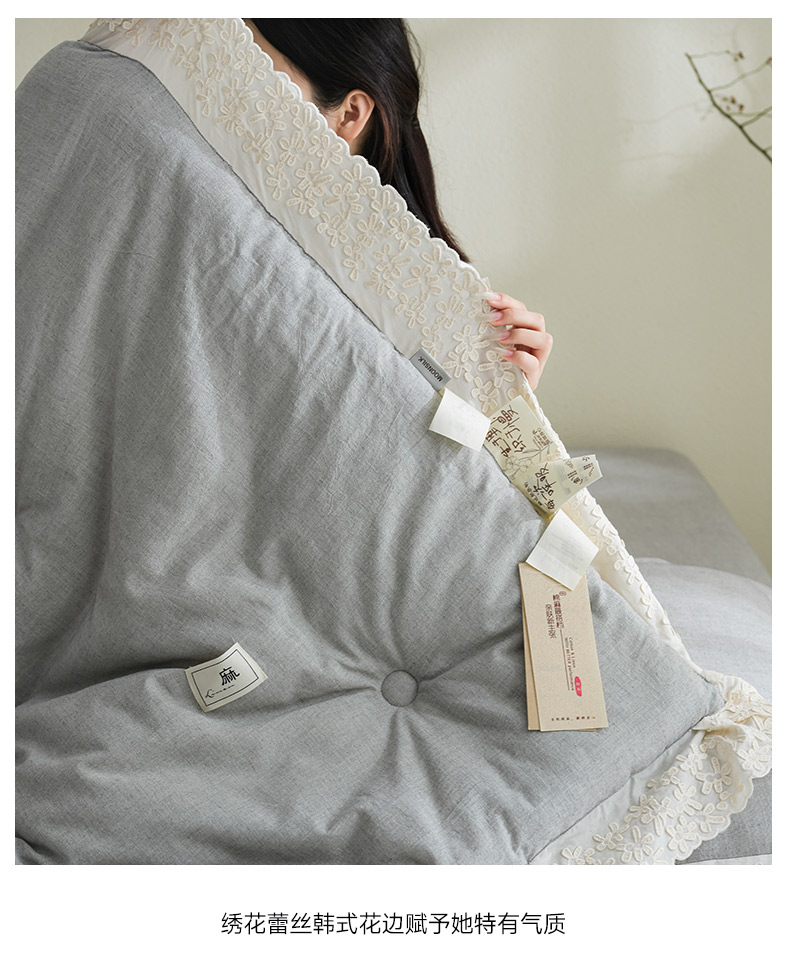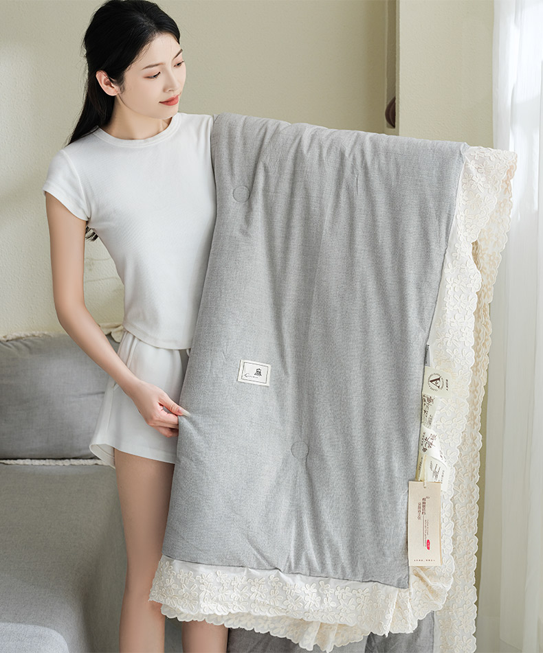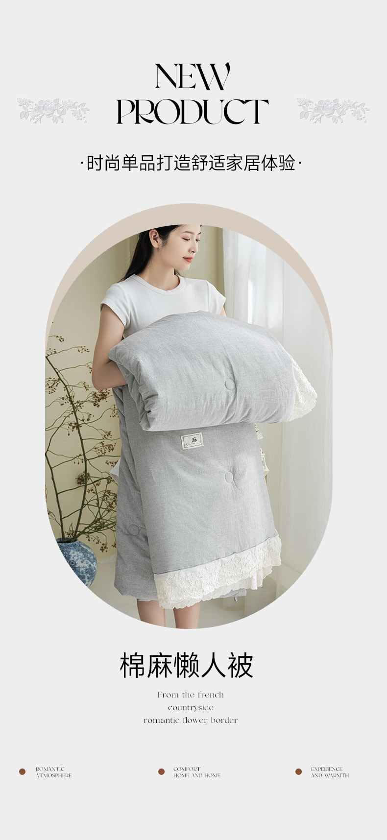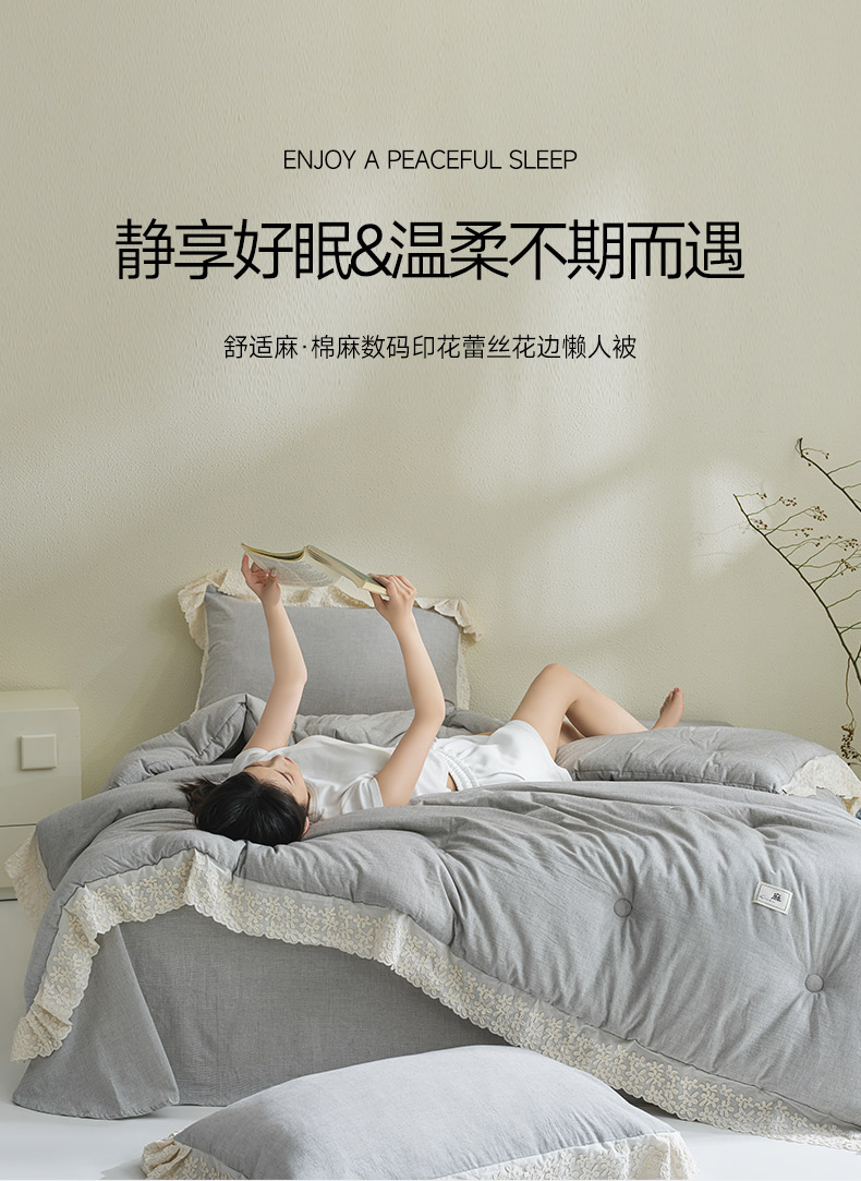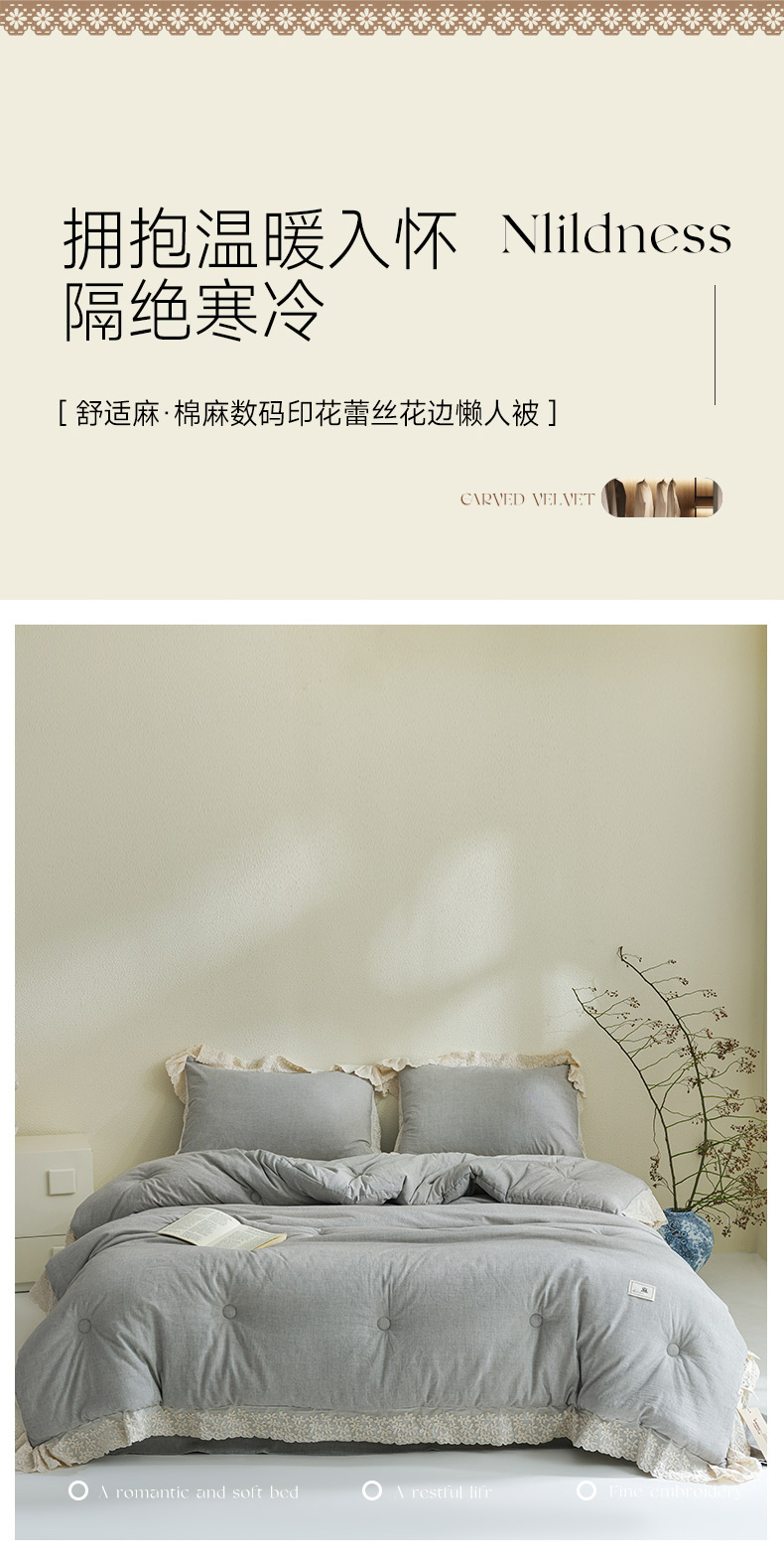 商品名称:桂雅居 2025新款舒适麻棉麻数码印花蕾丝花边懒人被被子被芯 烟墨灰