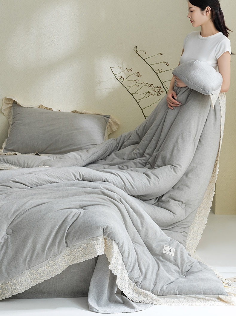 桂雅居 2025新款舒适麻棉麻数码印花蕾丝花边懒人被被子被芯 烟墨灰