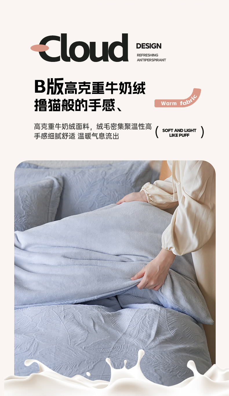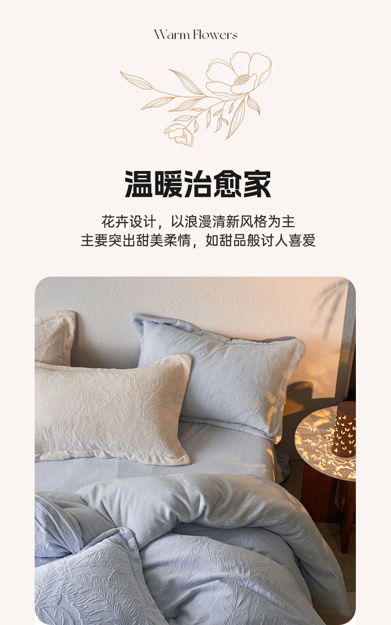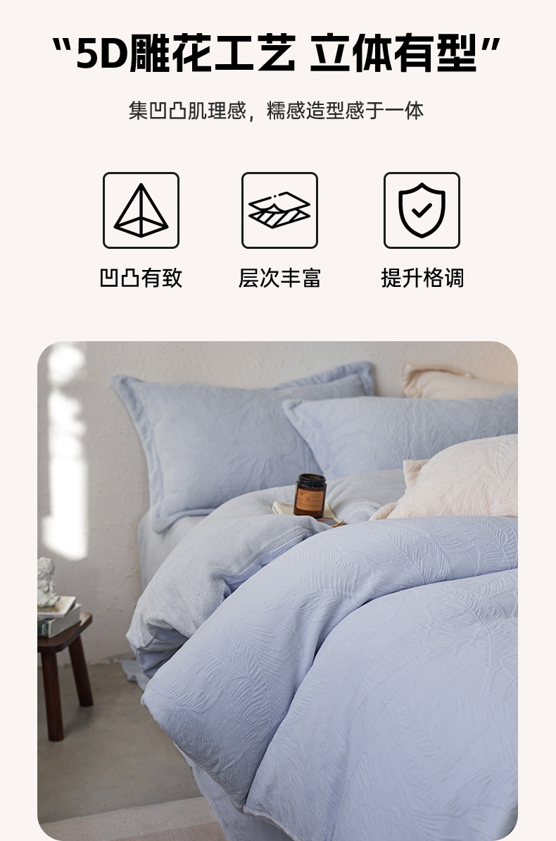 当前位置: 91家纺网 > 商品网购 > 床品套件 > 四件套 > 牛奶绒四件套 > 亿梵家居 2025秋冬新款A类全消光牛奶绒立体5D雕花绒四件套-风格一 (提供买家秀) 芭提雅-天空蓝