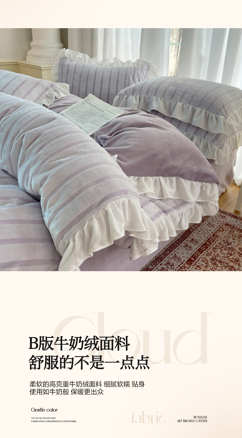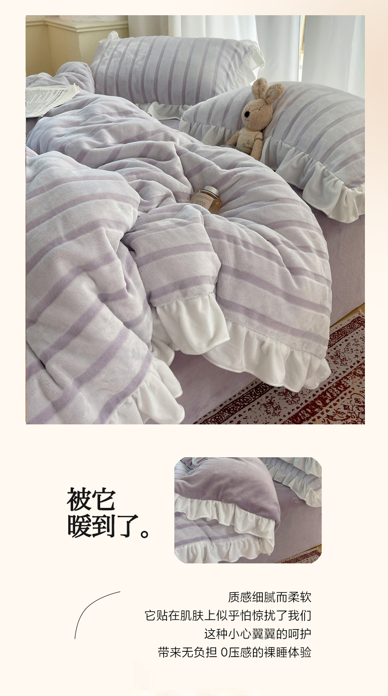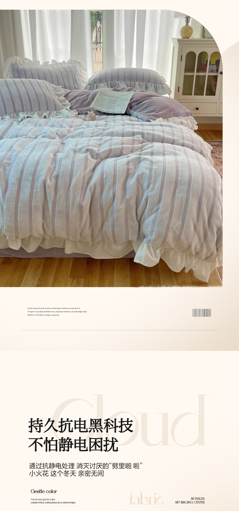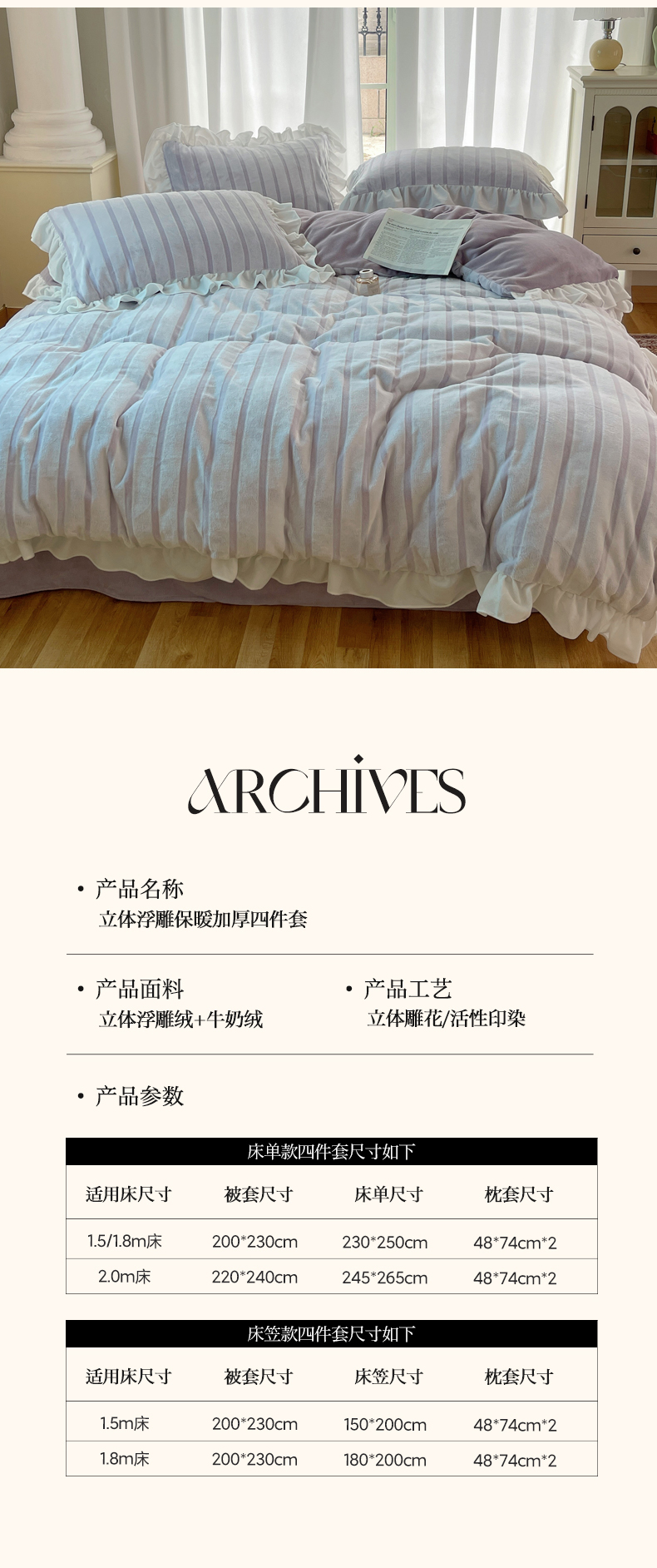 当前位置: 91家纺网 > 商品网购 > 床品套件 > 四件套 > 牛奶绒四件套 > 三朵家纺 2025新款3D立体加厚雕花绒牛奶绒花边款四件套 花边宽条-紫