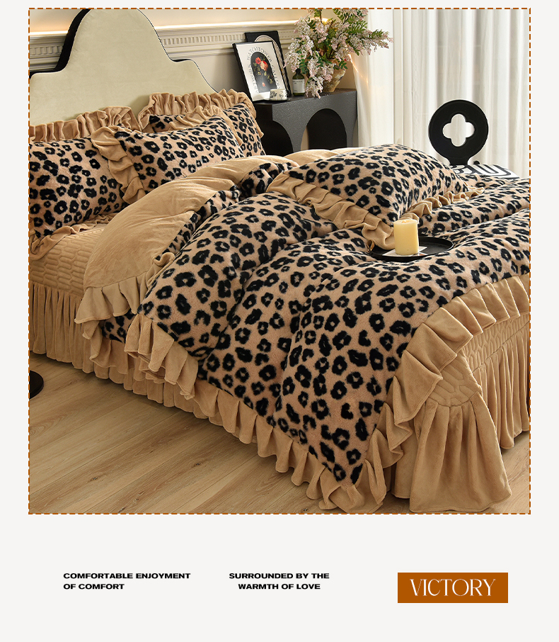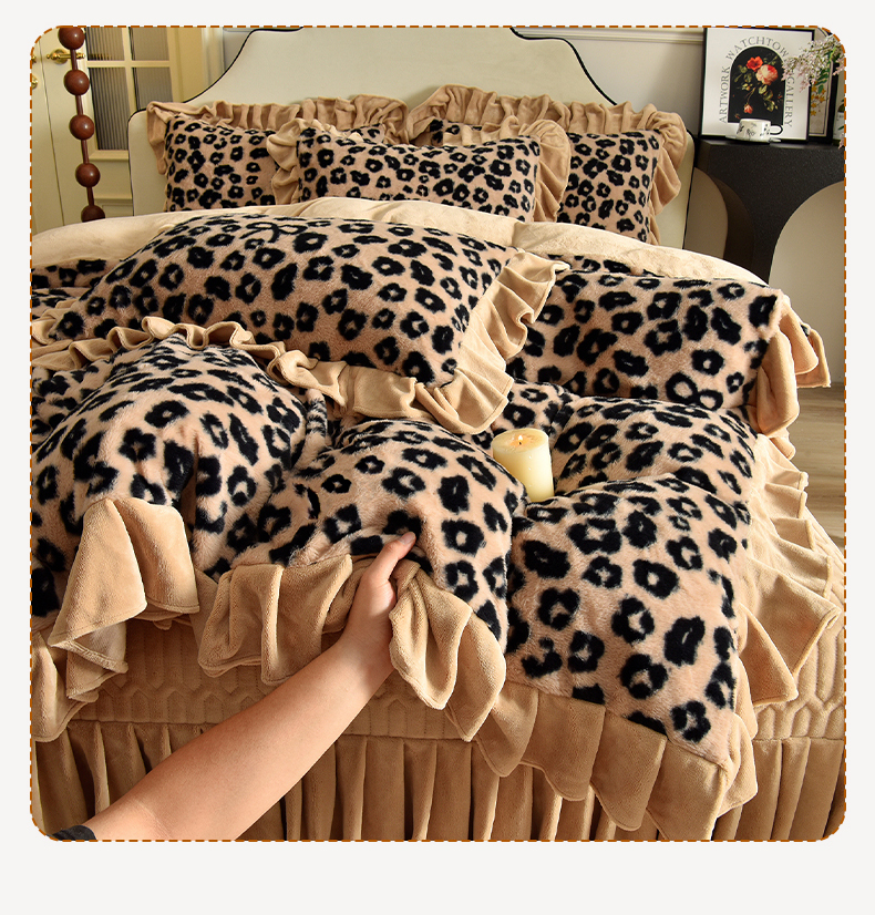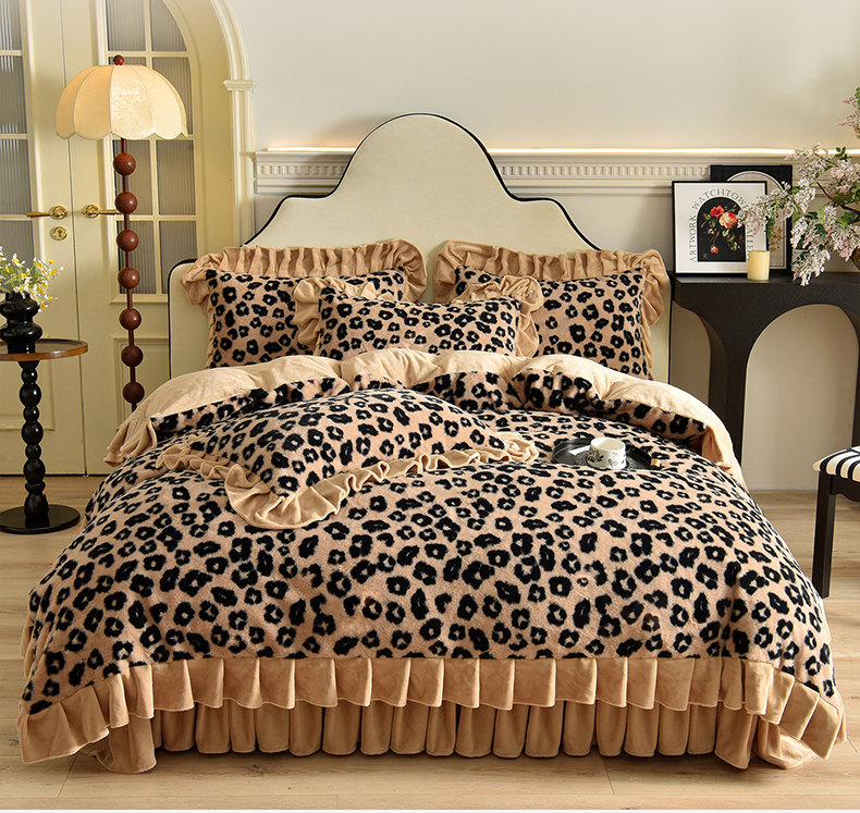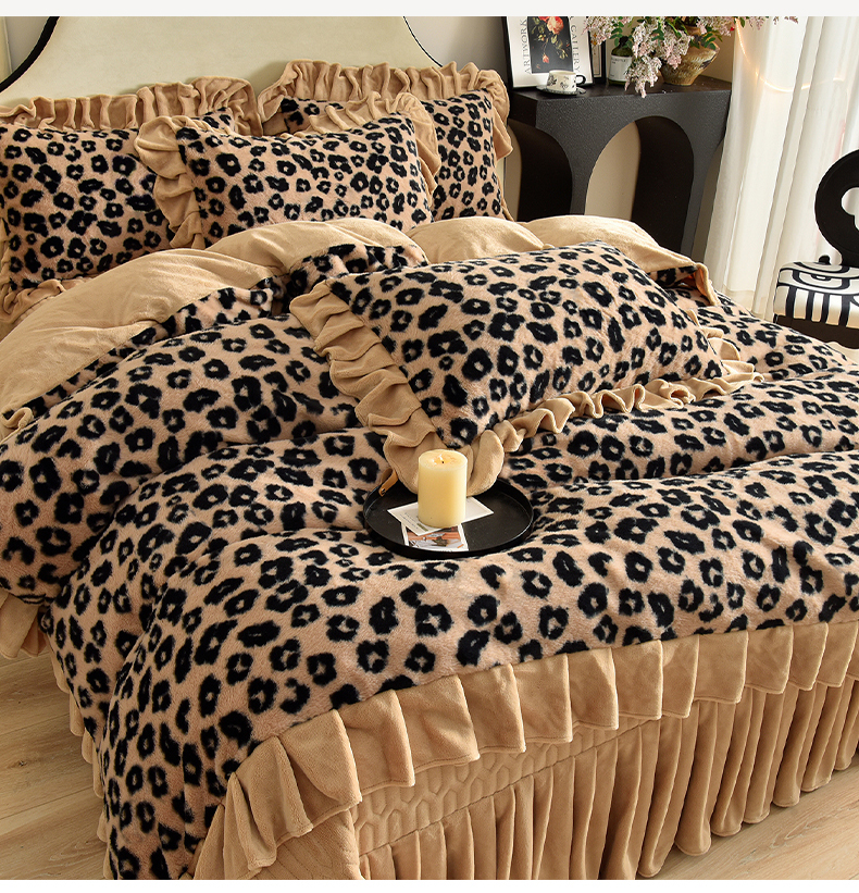 茉保家纺 2025新款9.5斤秋冬保暖牛奶绒印花兔毛绒四件套 豹纹咖