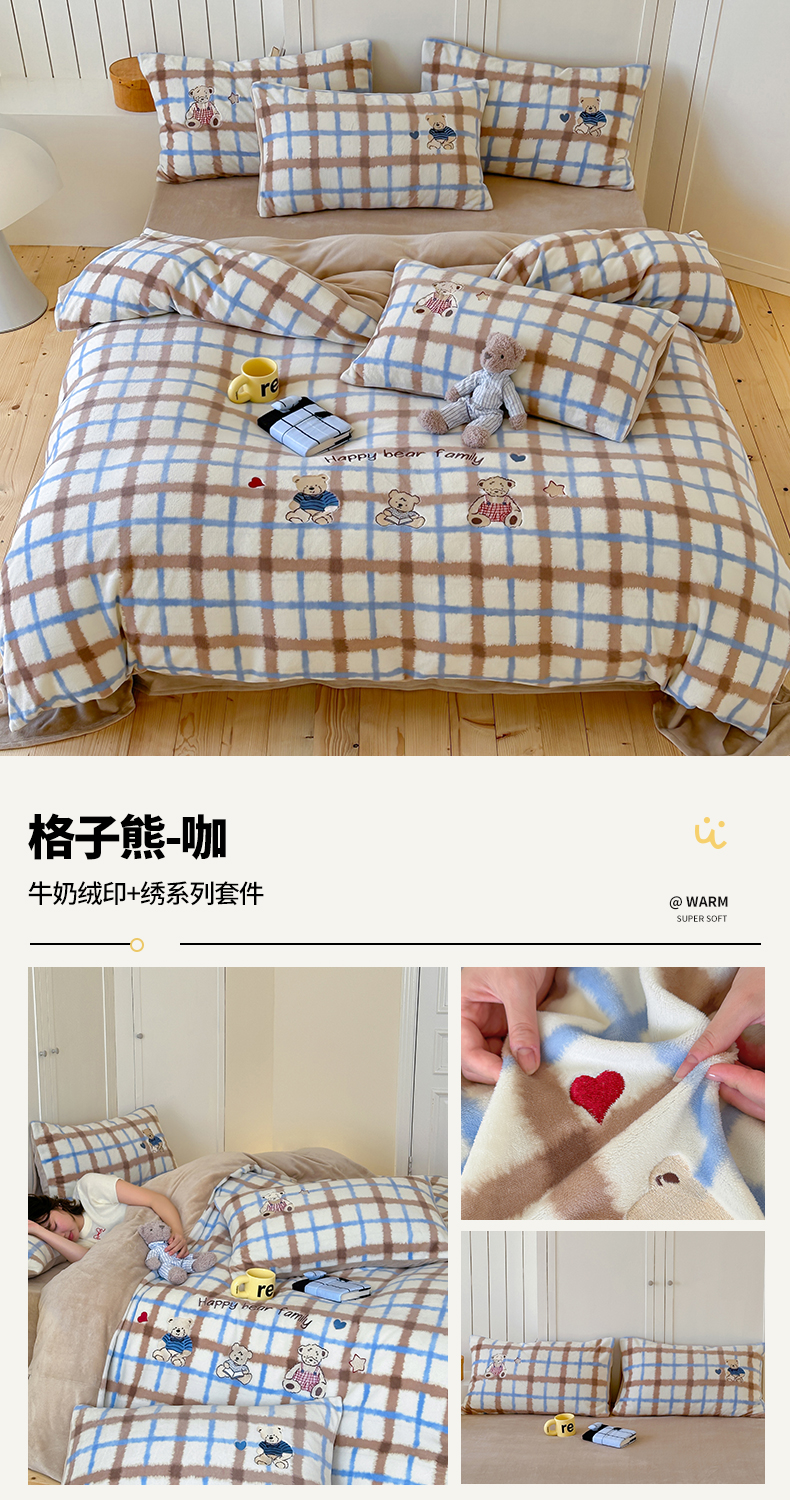 优悦生活馆 2025新款牛奶绒卡通印花刺绣四件套系列 格子熊-咖