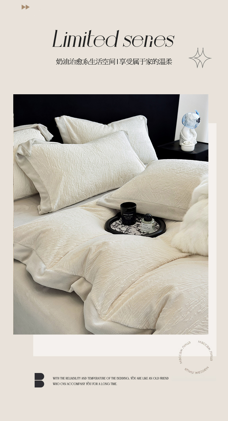 商品名称:2025新款高克重230克雕花绒纹理牛奶绒四件套秋冬轻奢拼角系列四件套-柏林晚风系列 柏林晚风-浅米