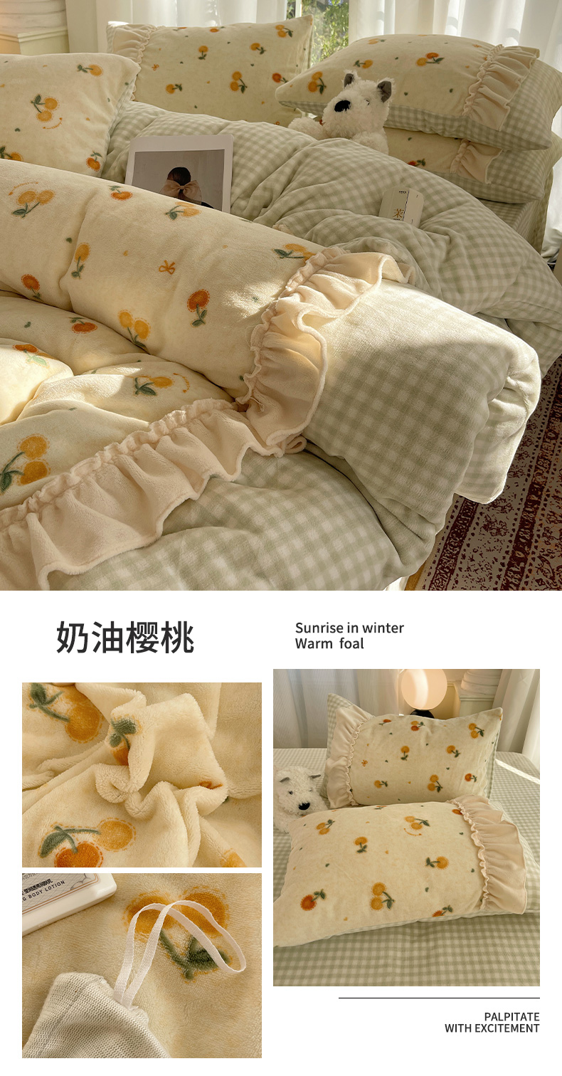 商品名称:瑞莱 2025冬季创意花边A类牛奶绒四件套套件 粉蝴蝶结