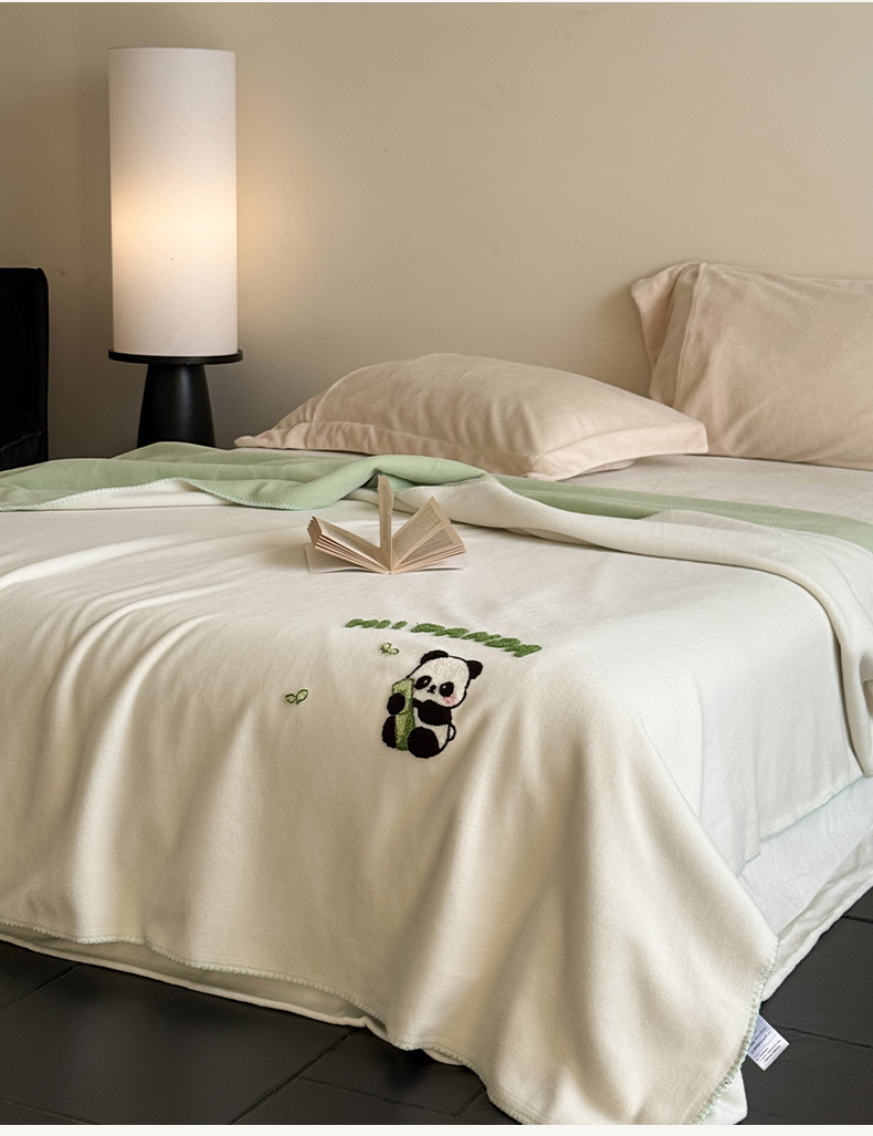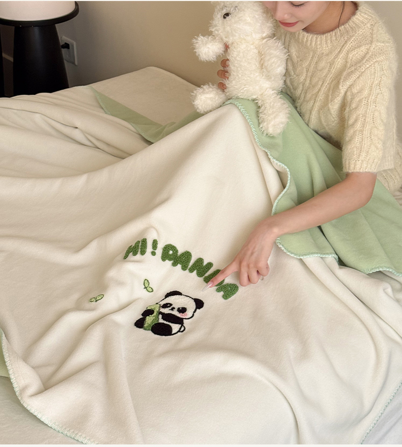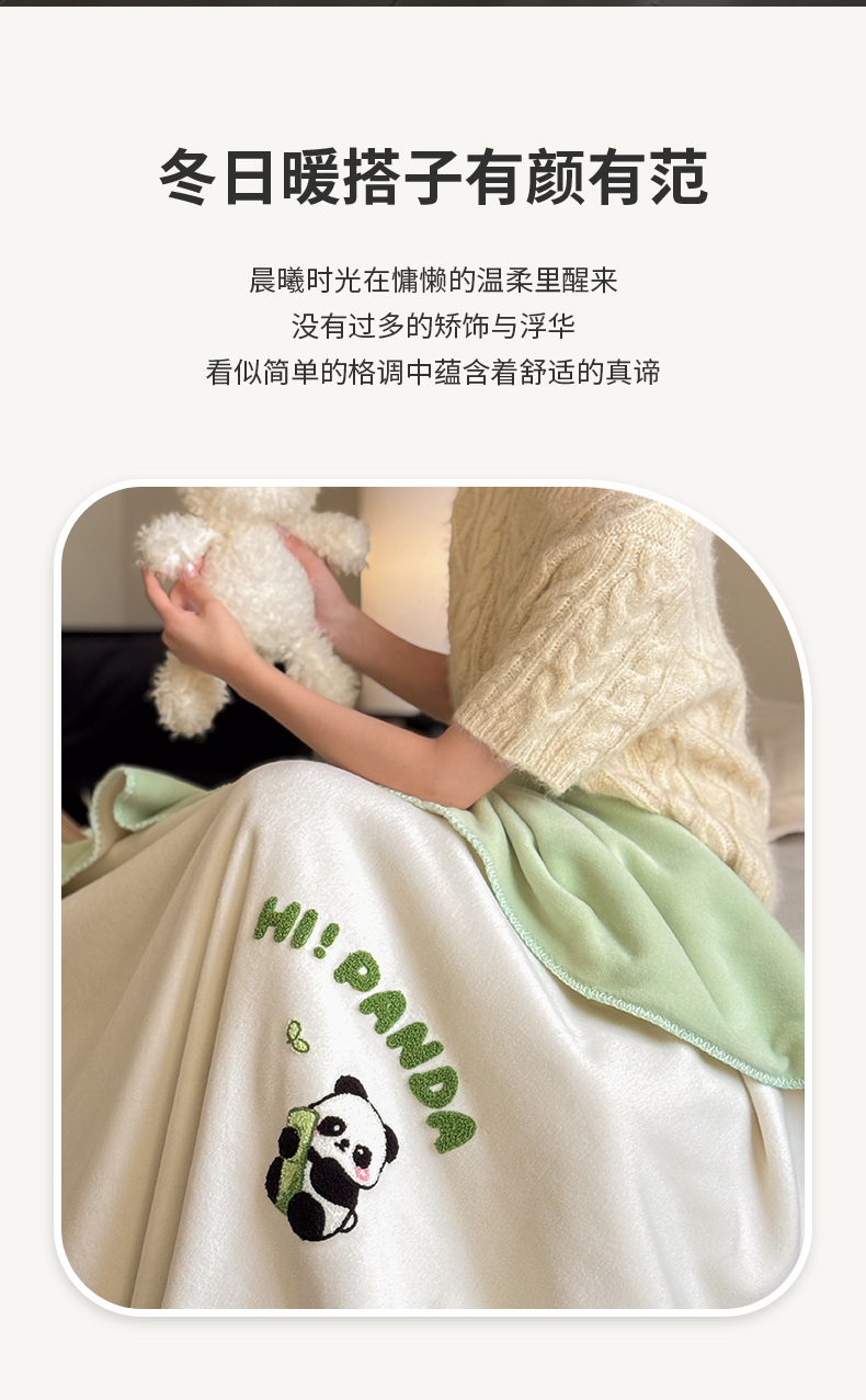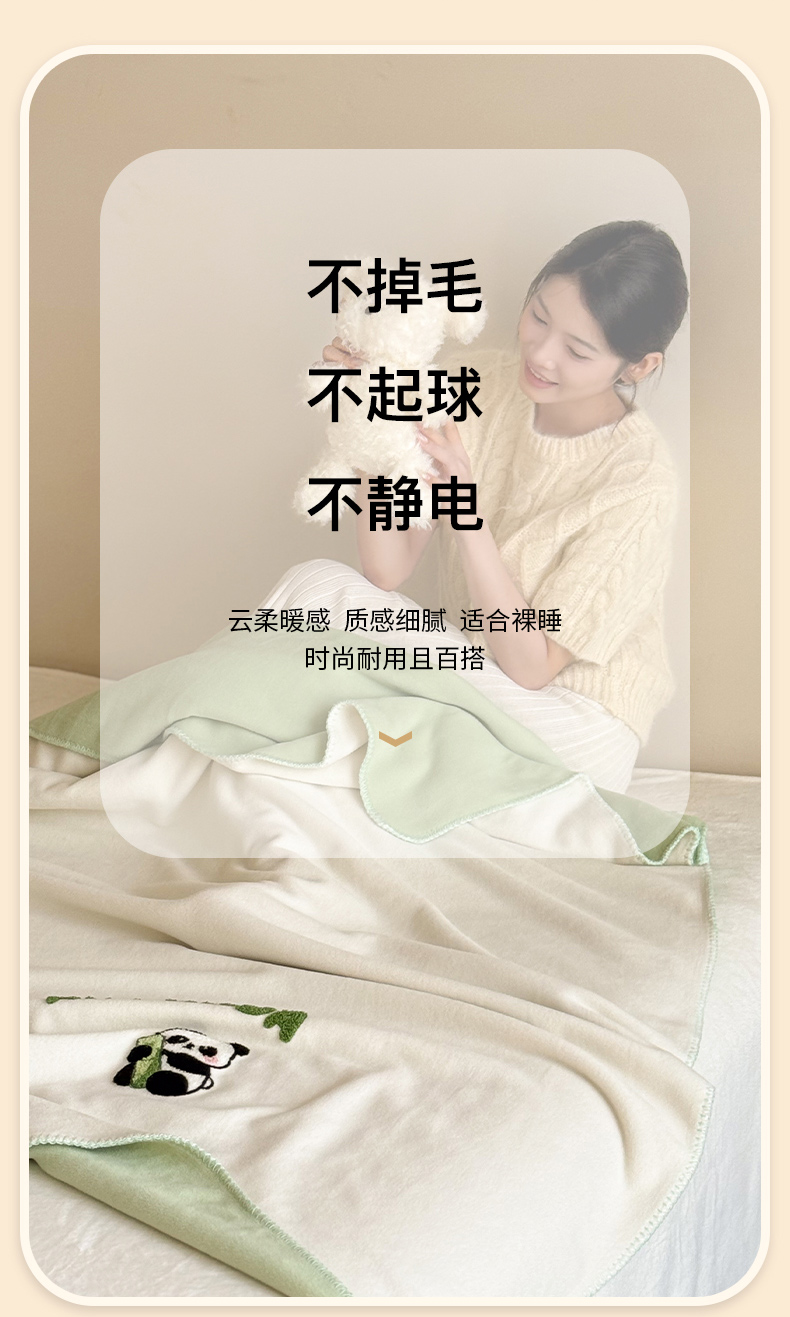 商品名称:云栖家居 2025新品双层加厚高克重消光沙发毯仿羊绒纯色刺绣盖毛毯毯子 小熊猫-绿