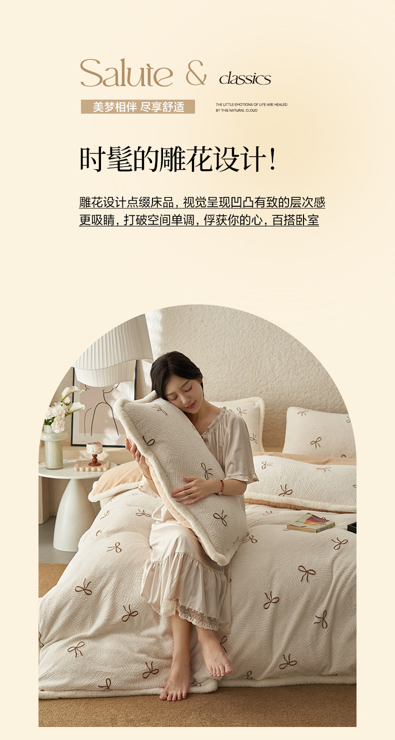 当前位置: 91家纺网 > 商品网购 > 床品套件 > 四件套 > 牛奶绒四件套 > 晨曦家纺 2025新款加厚加绒牛奶绒雕花四件套暖暖少女温柔风 小确幸-悠粉