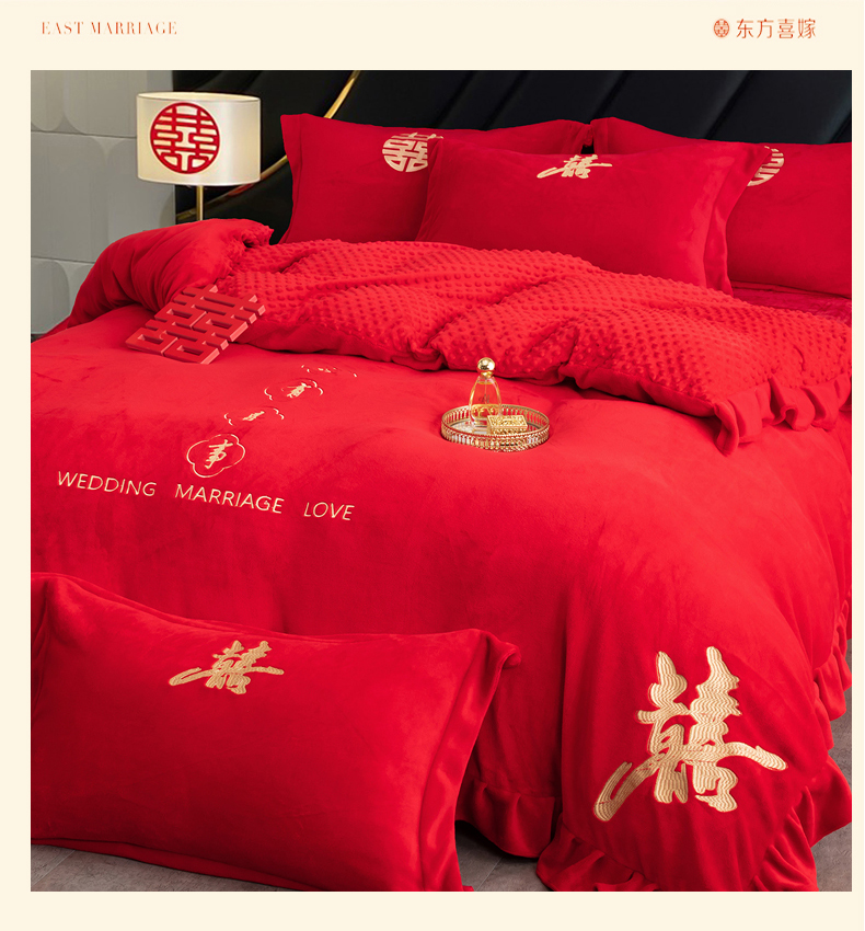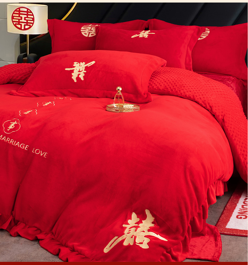 卓缦家纺 2025新款牛奶绒豆豆绒婚庆四件套 双喜临门