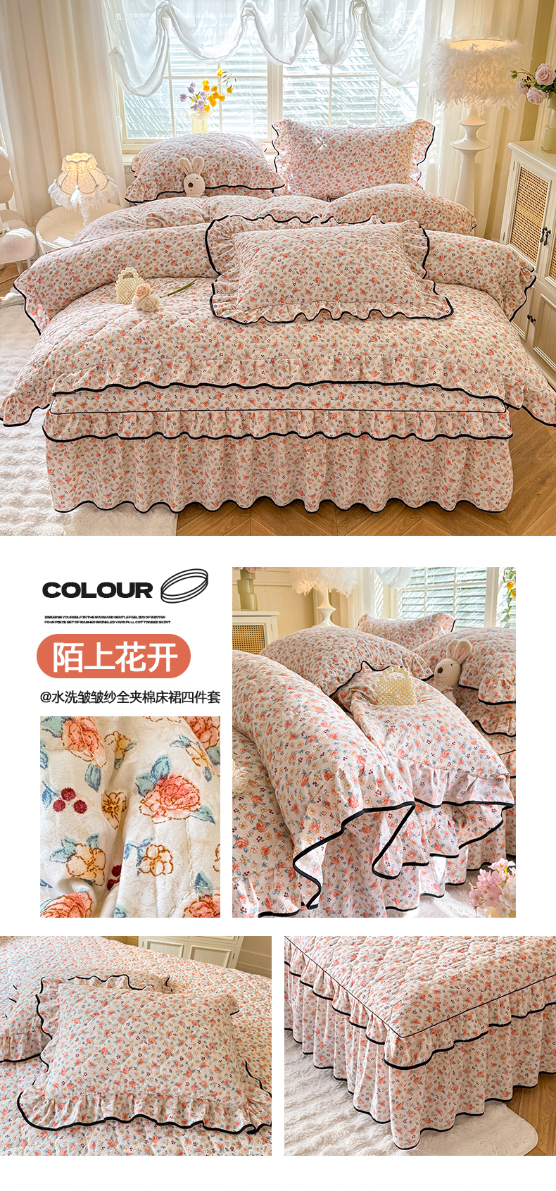 商品名称:优家居 2025新品水洗棉全夹棉床裙四件套韩版糯糯棉水洗皱皱纱床罩花边被套枕套直播爆款 繁花似锦