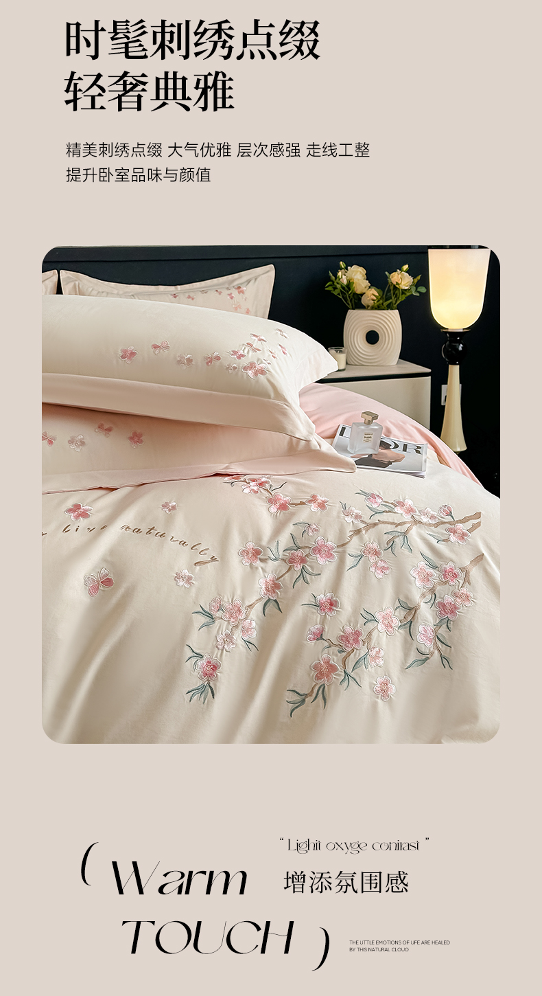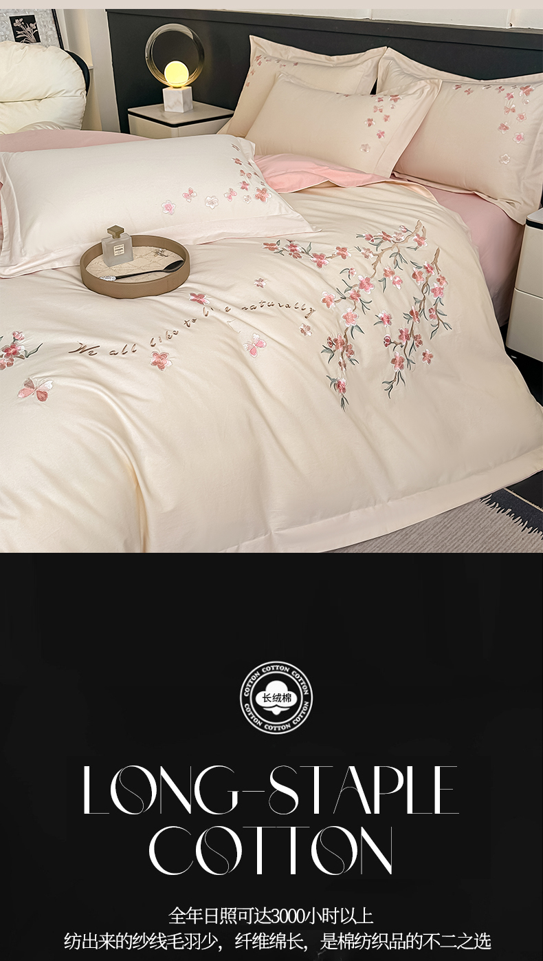 (总)桃园 新款纯棉全棉长绒棉刺绣绣花高端礼盒初暖系列四件套,白紫色,白粉色,轻奢粉,飘蓝色