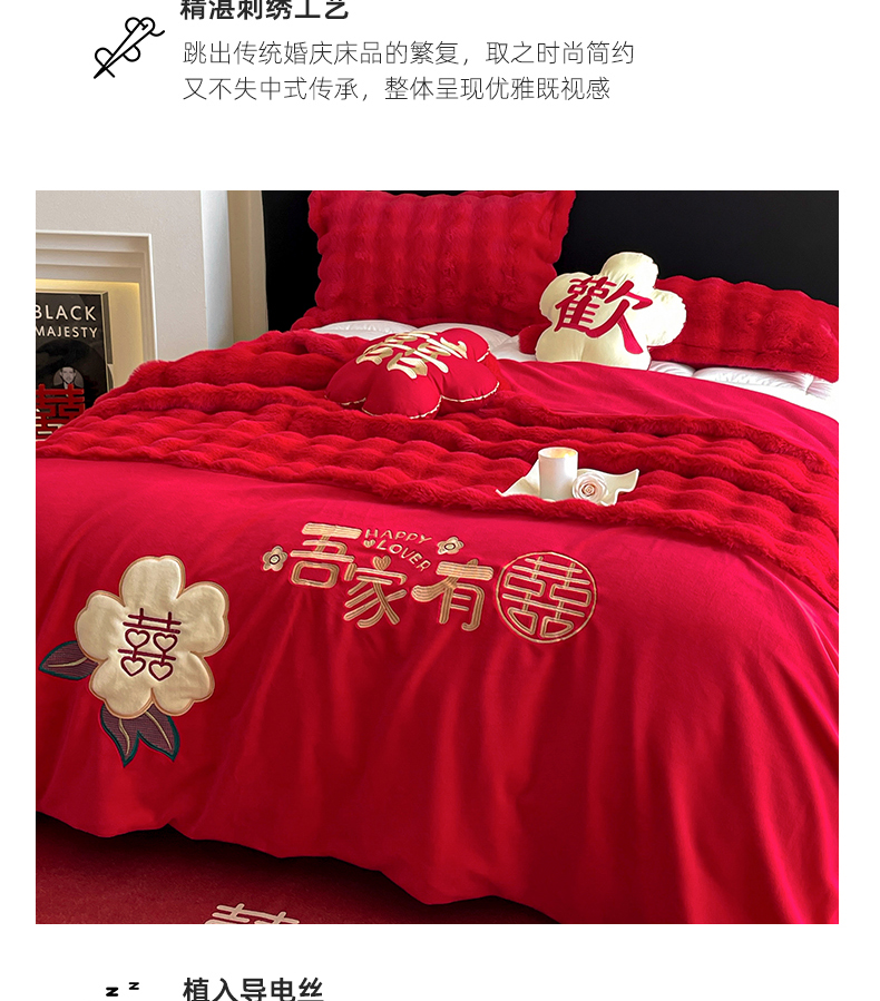 (总)2025新款高克重花边贴布款牛奶绒婚庆刺绣四件套,牛奶绒花边款-喜事临门,牛奶绒花边款-龙凤祥瑞,牛奶绒婚庆-玫瑰,牛奶绒婚庆-吾家有喜,牛奶绒婚庆-喜乐,牛奶绒婚庆-挚爱