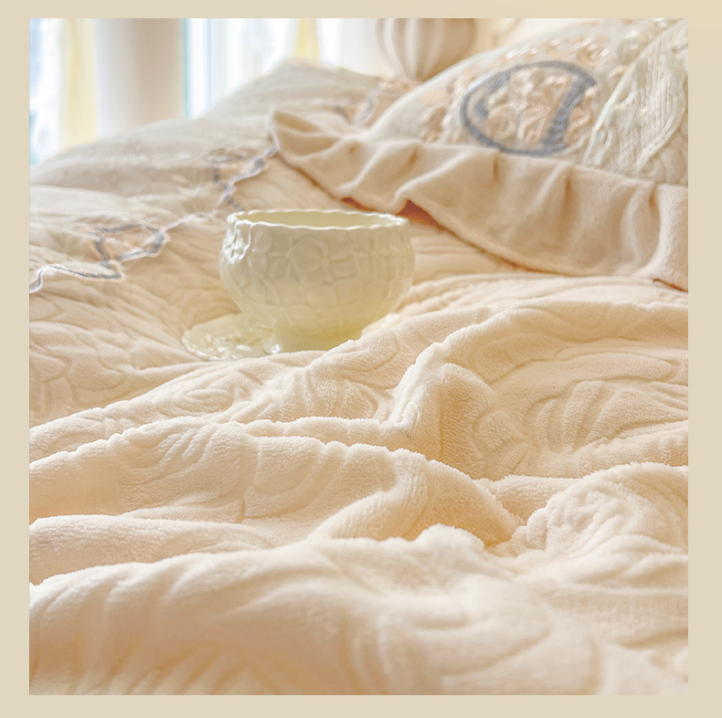 商品名称:恋尚 2025新款雕花牛奶绒绗缝夹棉床盖单品-可可西里(控价145起) 可可西里-奶油白